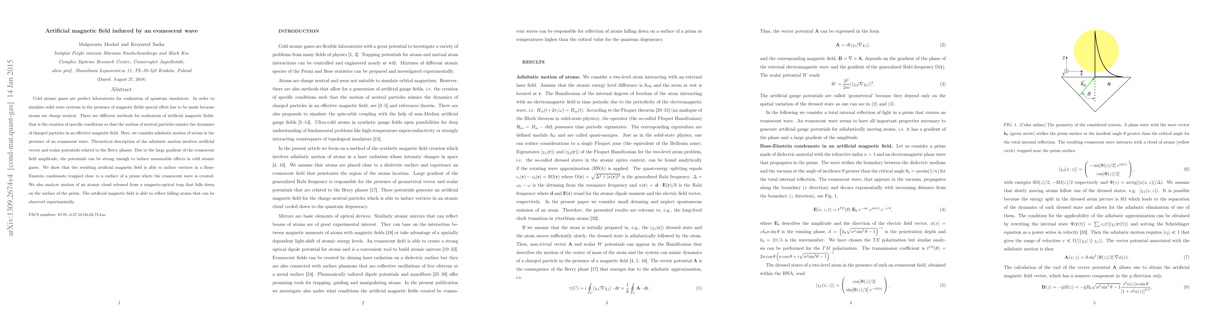 Cold atomic gases are perfect laboratories for realization of quantum simulators. In order to simulate solid state systems in the presence of magnetic fields special effort has to be made because atoms are charge neutral. There are different methods for realization of artificial magnetic fields, that is the creation of specific conditions so that the motion of neutral particles mimics the dynamics of charged particles in an effective magnetic field. Here, we consider adiabatic motion of atoms in the presence of an evanescent wave. Theoretical description of the adiabatic motion involves artificial vector and scalar potentials related to the Berry phases. Due to the large gradient of the evanescent field amplitude, the potentials can be strong enough to induce measurable effects in cold atomic gases. We show that the resulting artificial magnetic field is able to induce vortices in a Bose-Einstein condensate trapped close to a surface of a prism where the evanescent wave is created. We also analyze motion of an atomic cloud released from a magneto-optical trap that falls down on the surface of the prism. The artificial magnetic field is able to reflect falling atoms that can be observed experimentally.