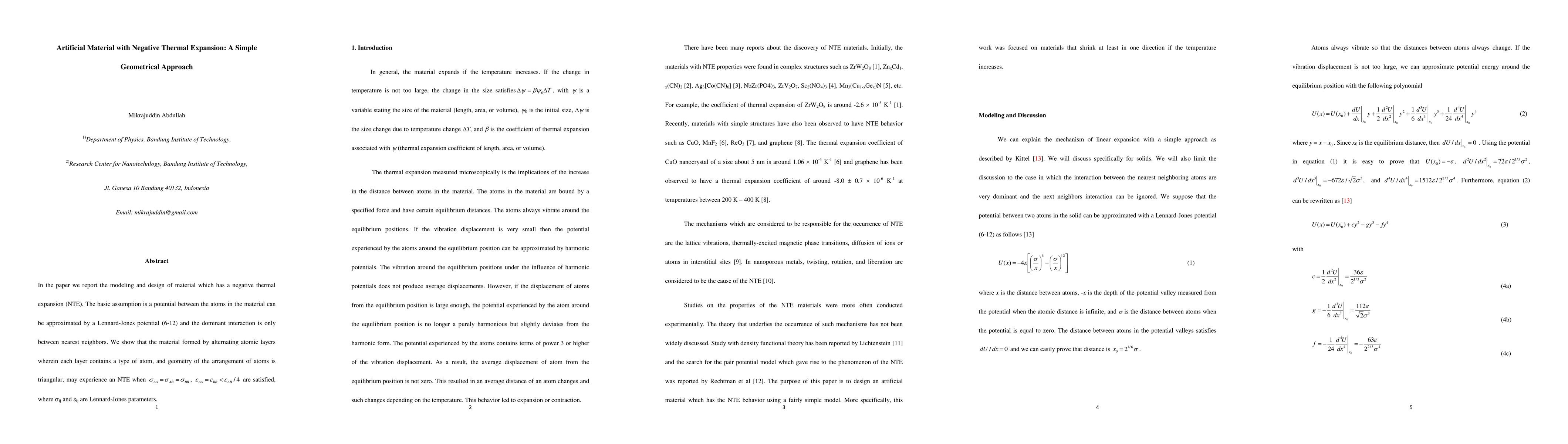 In the paper we report the modeling and design of material which has a negative thermal expansion (NTE). The basic assumption is a potential between the atoms in the material can be approximated by a Lennard-Jones potential (6-12) and the dominant interaction is only between nearest neighbors. We show that the material formed by alternating atomic layers wherein each layer contains a type of atom, and geometry of the arrangement of atoms is triangular, may experience an NTE when sigma_AA = sigma_BB = sigma_AB, epsilon_AA = epsilon_BB < epsilon_AB/4 are satisfied, where sigma_ij and epsilon_ij are Lennard-Jones parameters