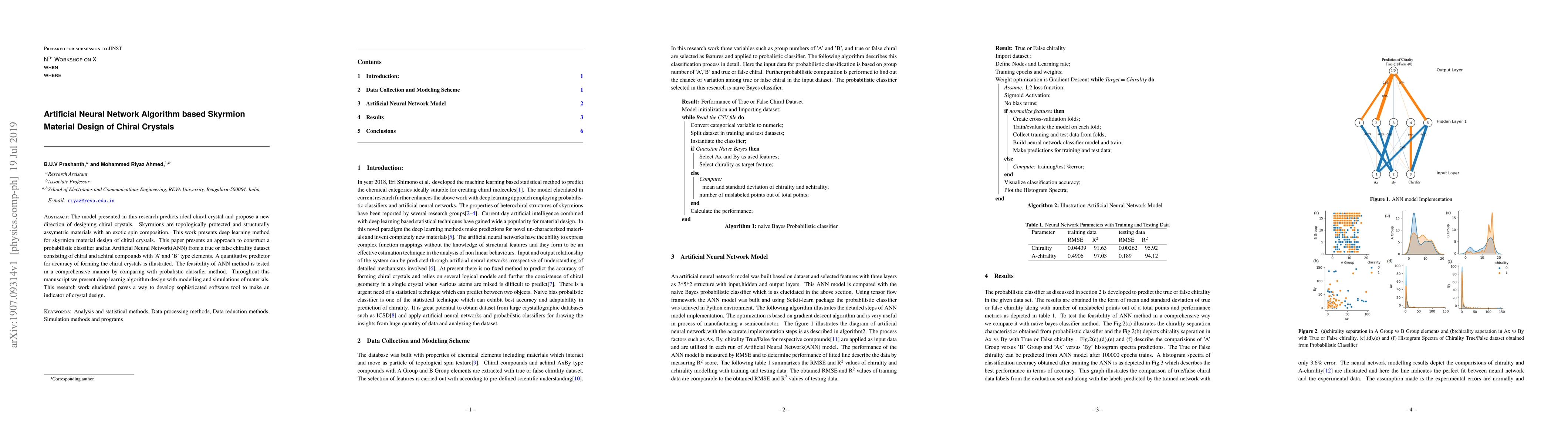 The model presented in this research predicts ideal chiral crystal and propose a new direction of designing chiral crystals. Skyrmions are topologically protected and structurally assymetric materials with an exotic spin composition. This work presents deep learning method for skyrmion material design of chiral crystals. This paper presents an approach to construct a probabilistic classifier and an Artificial Neural Network(ANN) from a true or false chirality dataset consisting of chiral and achiral compounds with 'A' and 'B' type elements. A quantitative predictor for accuracy of forming the chiral crystals is illustrated. The feasibility of ANN method is tested in a comprehensive manner by comparing with probalistic classifier method. Throughout this manuscript we present deep learnig algorithm design with modelling and simulations of materials. This research work elucidated paves a way to develop sophisticated software tool to make an indicator of crystal design.