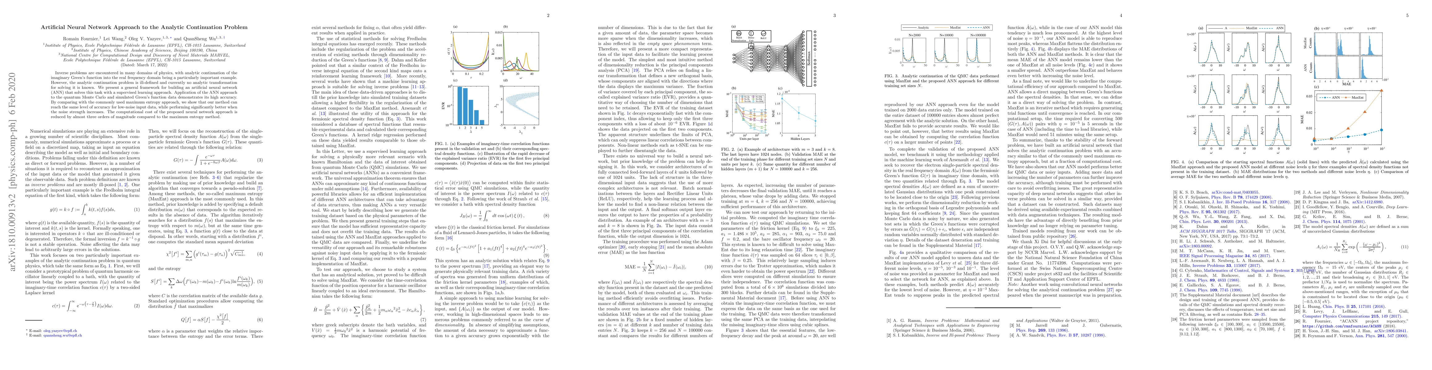 This paper proposes an artificial neural network (ANN) framework for solving the ill-defined analytic continuation problem, demonstrating high accuracy in quantum Monte Carlo calculations and outperforming the maximum entropy method under noisy conditions. The ANN approach significantly reduces computational costs by nearly three orders of magnitude.