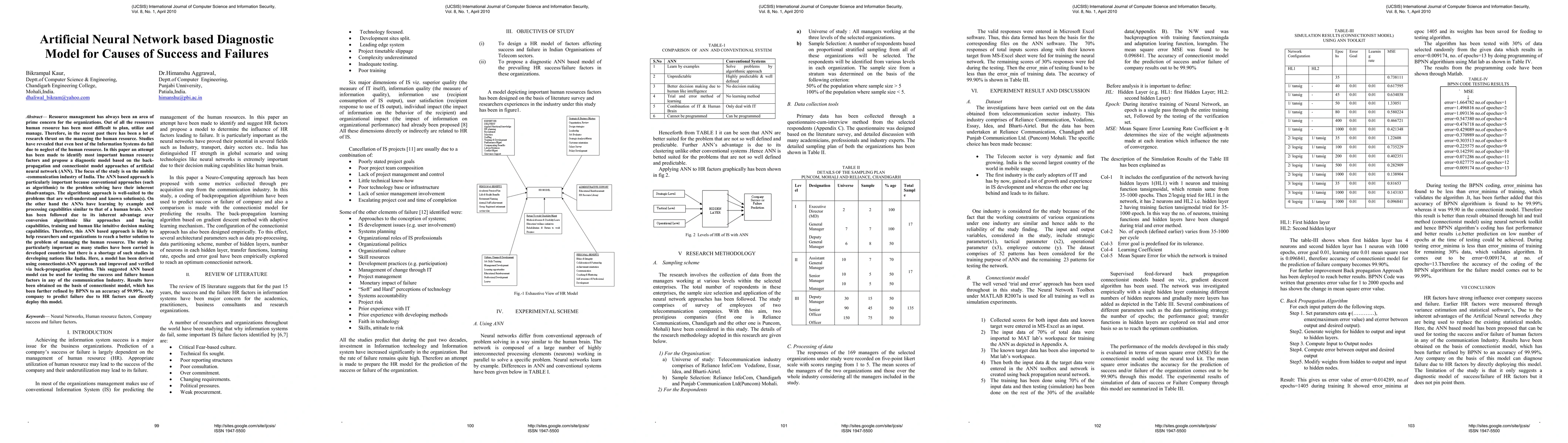 In this paper an attempt has been made to identify most important human resource factors and propose a diagnostic model based on the back-propagation and connectionist model approaches of artificial neural network (ANN). The focus of the study is on the mobile -communication industry of India. The ANN based approach is particularly important because conventional approaches (such as algorithmic) to the problem solving have their inherent disadvantages. The algorithmic approach is well-suited to the problems that are well-understood and known solution(s). On the other hand the ANNs have learning by example and processing capabilities similar to that of a human brain. ANN has been followed due to its inherent advantage over conversion algorithmic like approaches and having capabilities, training and human like intuitive decision making capabilities. Therefore, this ANN based approach is likely to help researchers and organizations to reach a better solution to the problem of managing the human resource. The study is particularly important as many studies have been carried in developed countries but there is a shortage of such studies in developing nations like India. Here, a model has been derived using connectionist-ANN approach and improved and verified via back-propagation algorithm. This suggested ANN based model can be used for testing the success and failure human factors in any of the communication Industry. Results have been obtained on the basis of connectionist model, which has been further refined by BPNN to an accuracy of 99.99%. Any company to predict failure due to HR factors can directly deploy this model.