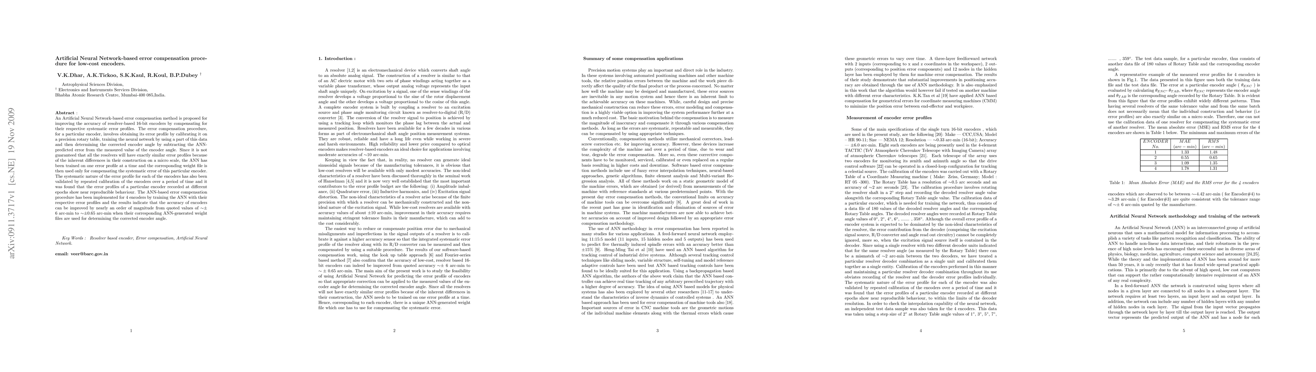An Artificial Neural Network-based error compensation method is proposed for improving the accuracy of resolver-based 16-bit encoders by compensating for their respective systematic error profiles. The error compensation procedure, for a particular encoder, involves obtaining its error profile by calibrating it on a precision rotary table, training the neural network by using a part of this data and then determining the corrected encoder angle by subtracting the ANN-predicted error from the measured value of the encoder angle. Since it is not guaranteed that all the resolvers will have exactly similar error profiles because of the inherent differences in their construction on a micro scale, the ANN has been trained on one error profile at a time and the corresponding weight file is then used only for compensating the systematic error of this particular encoder. The systematic nature of the error profile for each of the encoders has also been validated by repeated calibration of the encoders over a period of time and it was found that the error profiles of a particular encoder recorded at different epochs show near reproducible behavior. The ANN-based error compensation procedure has been implemented for 4 encoders by training the ANN with their respective error profiles and the results indicate that the accuracy of encoders can be improved by nearly an order of magnitude from quoted values of ~6 arc-min to ~0.65 arc-min when their corresponding ANN-generated weight files are used for determining the corrected encoder angle.