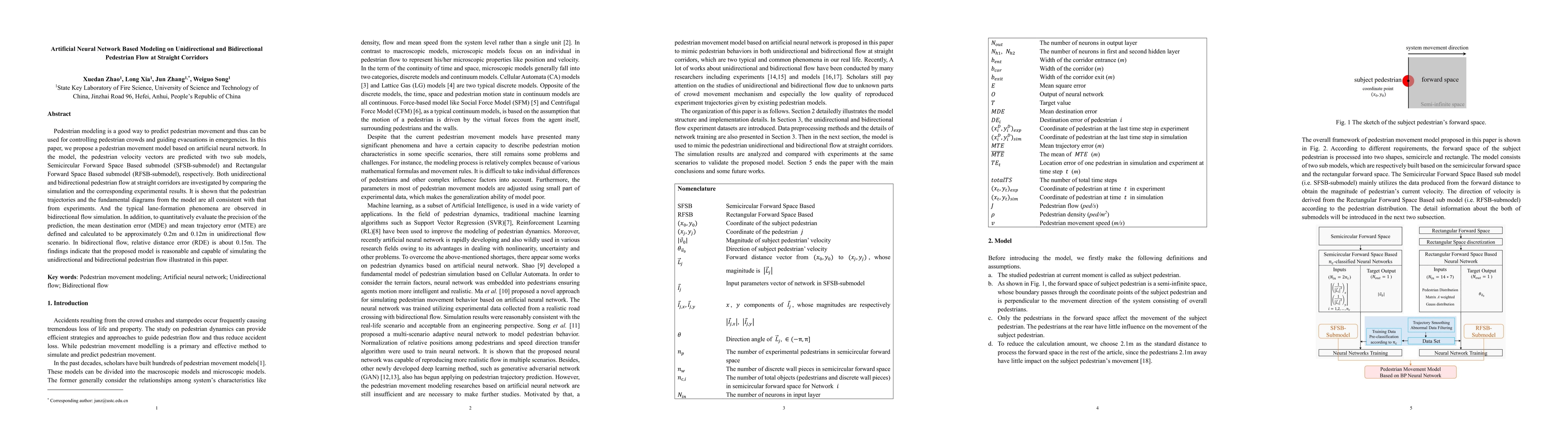 This paper proposes an artificial neural network model for predicting pedestrian movement in straight corridors, using two submodels for unidirectional and bidirectional flows. The model's accuracy is validated by comparing simulation results with experimental data, showing consistent pedestrian trajectories and fundamental diagrams, with mean errors of approximately 0.2m and 0.12m for unidirectional flow and 0.15m for bidirectional flow.