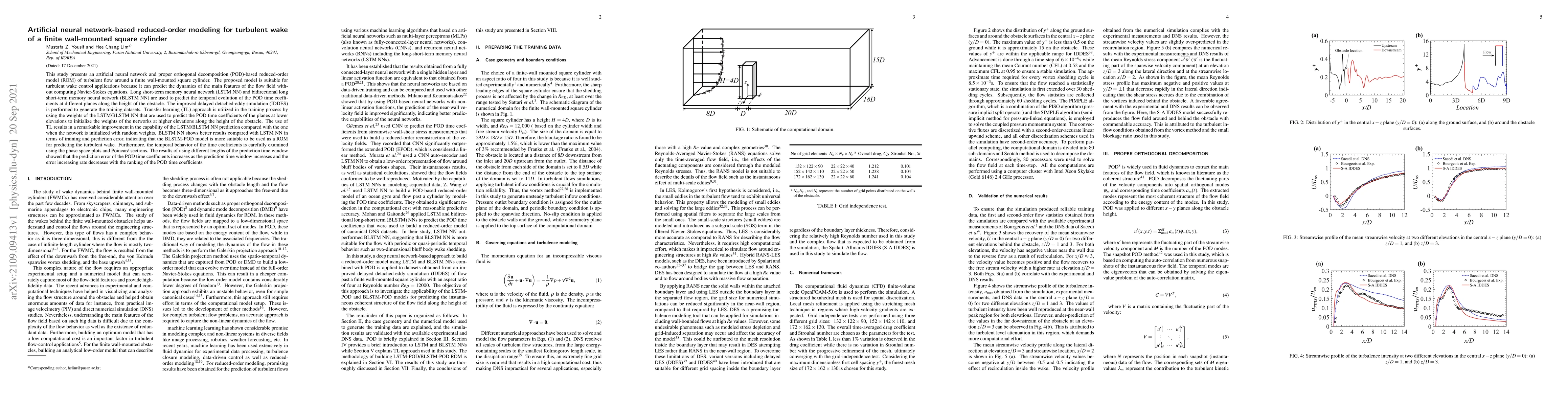 This study develops an artificial neural network-based reduced-order model (ROM) using LSTM and BLSTM networks for predicting the turbulent wake dynamics around a finite wall-mounted square cylinder, showing that BLSTM-POD is more effective for turbulent wake control applications. Transfer learning enhances prediction accuracy compared to random initialization.