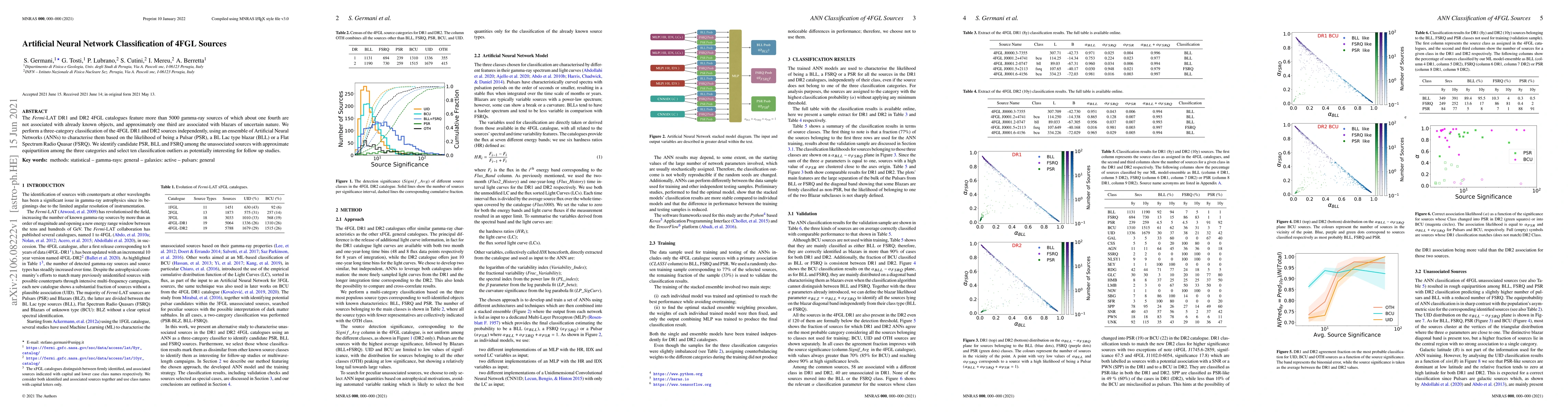 This paper uses an ensemble of Artificial Neural Networks to classify over 5000 gamma-ray sources from the Fermi-LAT 4FGL catalogues, distinguishing between Pulsars, BL Lac blazars, and Flat Spectrum Radio Quasars. It identifies candidates in each category among unassociated sources and highlights ten outliers for further investigation.