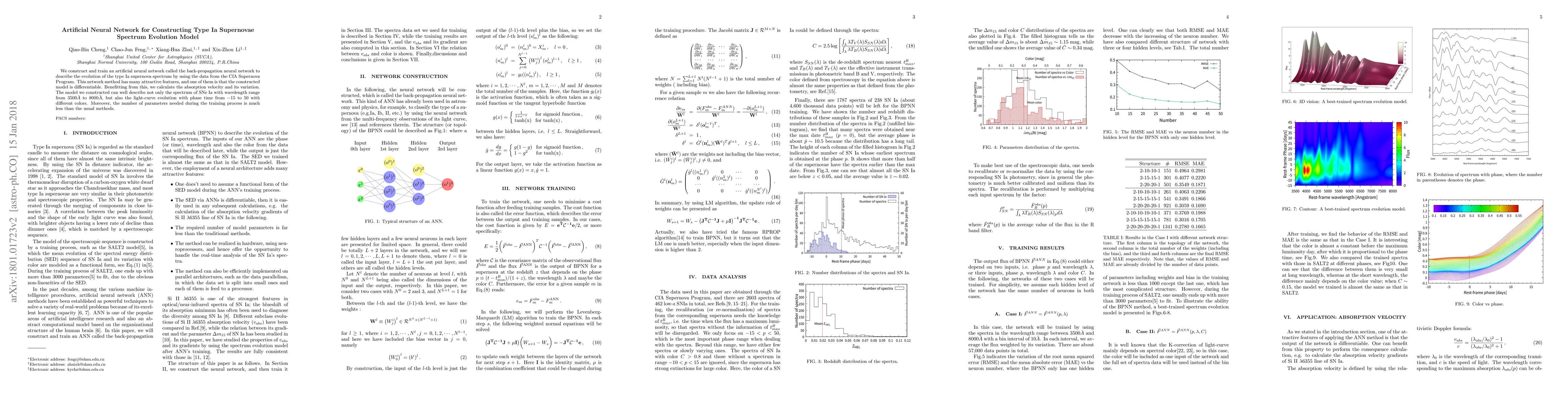 We construct and train an artificial neural network called the back-propagation neural network to describe the evolution of the type Ia supernova spectrum by using the data from the CfA Supernova Program. This network method has many attractive features, and one of them is that the constructed model is differentiable. Benefitting from this, we calculate the absorption velocity and its variation. The model we constructed can well describe not only the spectrum of SNe Ia with wavelength range from $3500\AA$ to $8000\AA$, but also the light-curve evolution with phase time from $-15$ to $50$ with different colors. Moreover, the number of parameters needed during the training process is much less than the usual methods.