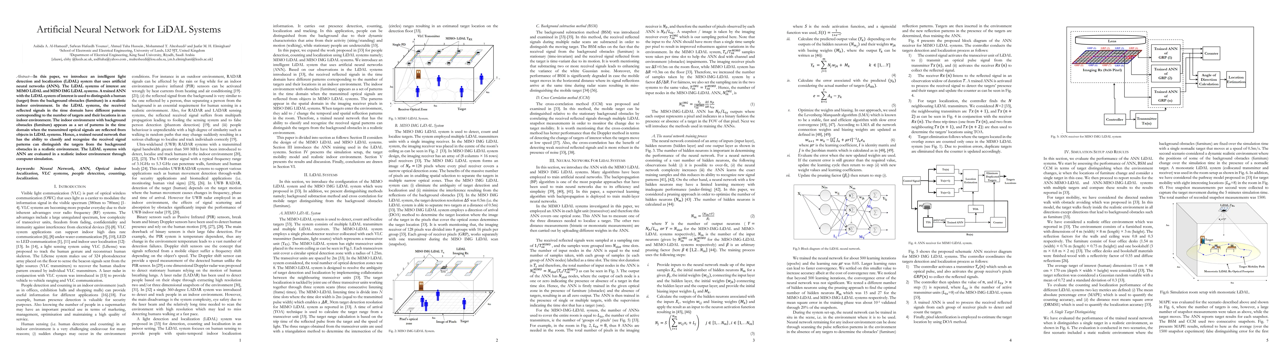 In this paper, we introduce an intelligent light detection and localization (LiDAL) system that uses artificial neural networks (ANN). The LiDAL systems of interest are MIMO LiDAL and MISO IMG LiDAL systems. A trained ANN with the LiDAL system of interest is used to distinguish a human (target) from the background obstacles (furniture) in a realistic indoor environment. In the LiDAL systems, the received reflected signals in the time domain have different patterns corresponding to the number of targets and their locations in an indoor environment. The indoor environment with background obstacles (furniture) appears as a set of patterns in the time domain when the transmitted optical signals are reflected from objects in LiDAL systems. Hence, a trained neural network that has the ability to classify and recognize the received signal patterns can distinguish the targets from the background obstacles in a realistic environment. The LiDAL systems with ANN are evaluated in a realistic indoor environment through computer simulation.
