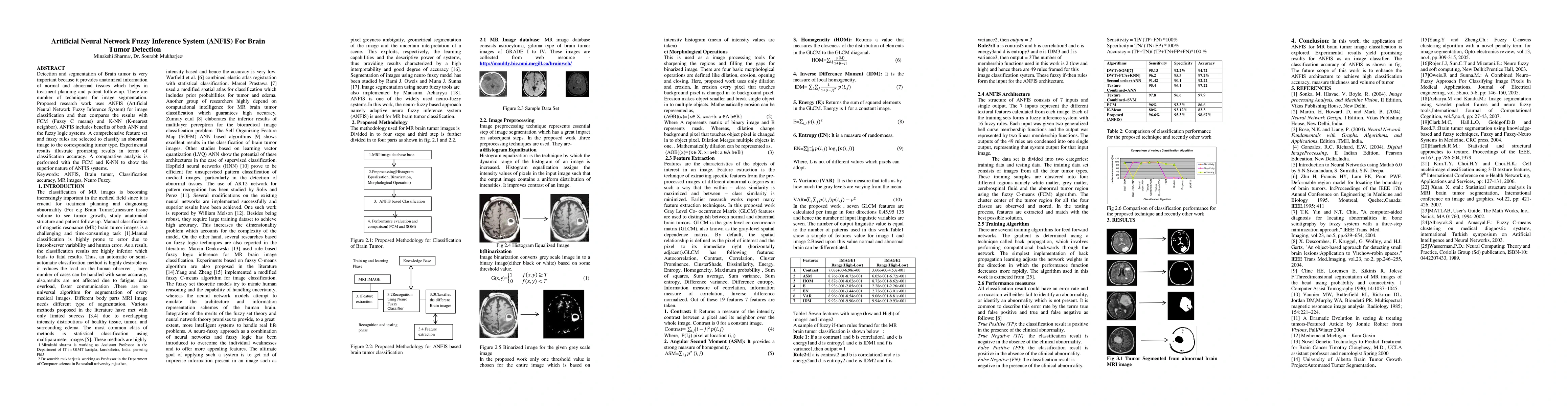 This paper proposes using an ANFIS for brain tumor detection and segmentation, combining the strengths of ANN and fuzzy logic. Experimental results show ANFIS outperforms FCM and K-NN in classification accuracy, highlighting its potential in treatment planning and patient follow-up.