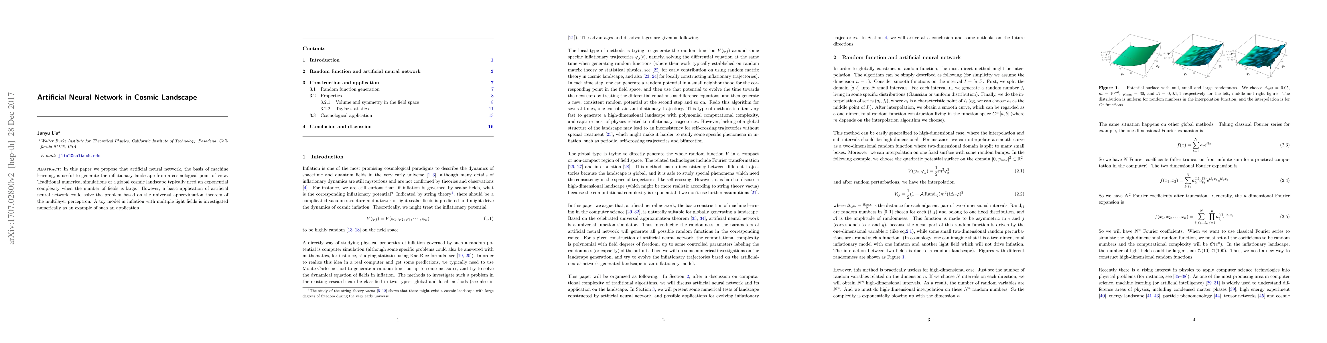 This paper explores using artificial neural networks to efficiently model the inflationary landscape in cosmology, leveraging the universal approximation theorem to reduce computational complexity compared to traditional simulations. A numerical example with multiple light fields demonstrates the potential of neural networks in this context.