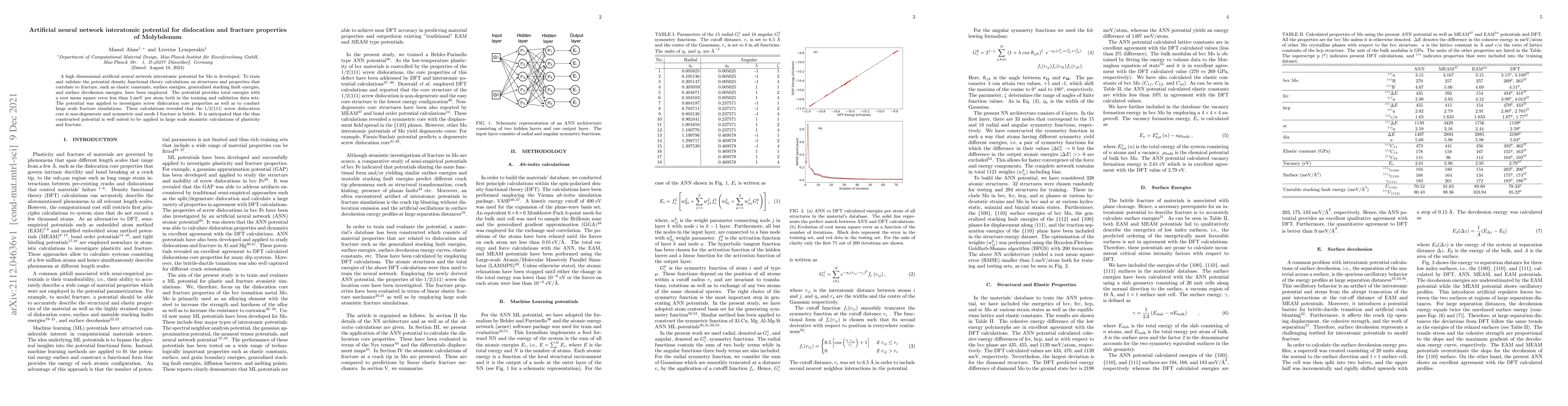 This paper develops a high-dimensional artificial neural network interatomic potential for Molybdenum, trained using density functional theory calculations. The potential accurately predicts properties related to fracture and dislocations, revealing non-degenerate screw dislocation cores and brittle mode I fracture, suitable for large-scale simulations of plasticity and fracture.