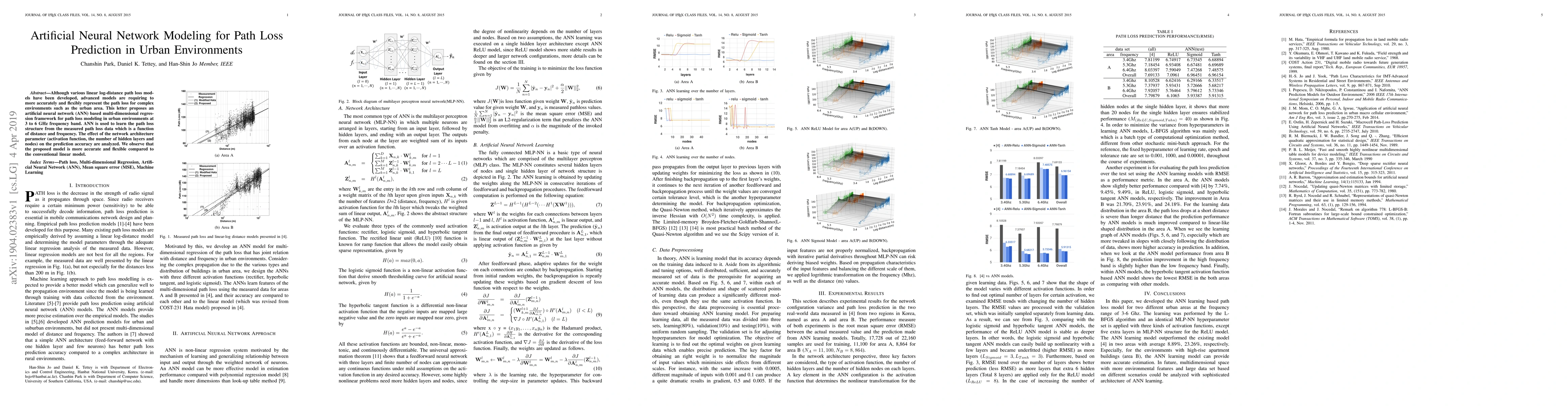 This paper proposes an artificial neural network (ANN) model for path loss prediction in urban environments, demonstrating improved accuracy and flexibility over traditional linear models by learning from measured path loss data across the 3 to 6 GHz frequency band. The study analyzes the impact of ANN architecture parameters on prediction accuracy.