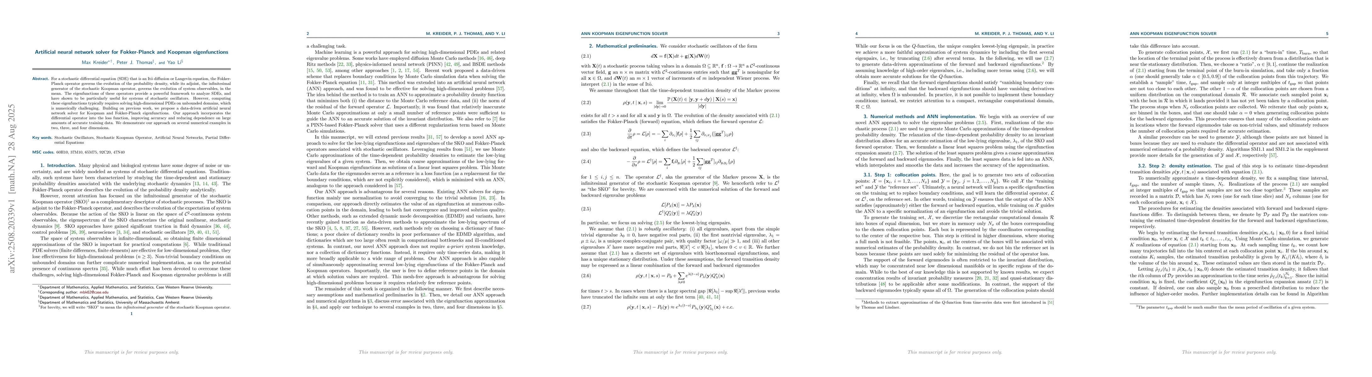 For a stochastic differential equation (SDE) that is an It\^{o} diffusion or Langevin equation, the Fokker-Planck operator governs the evolution of the probability density, while its adjoint, the infinitesimal generator of the stochastic Koopman operator, governs the evolution of system observables, in the mean. The eigenfunctions of these operators provide a powerful framework to analyze SDEs, and have shown to be particularly useful for systems of stochastic oscillators. However, computing these eigenfunctions typically requires solving high-dimensional PDEs on unbounded domains, which is numerically challenging. Building on previous work, we propose a data-driven artificial neural network solver for Koopman and Fokker-Planck eigenfunctions. Our approach incorporates the differential operator into the loss function, improving accuracy and reducing dependence on large amounts of accurate training data. We demonstrate our approach on several numerical examples in two, three, and four dimensions.