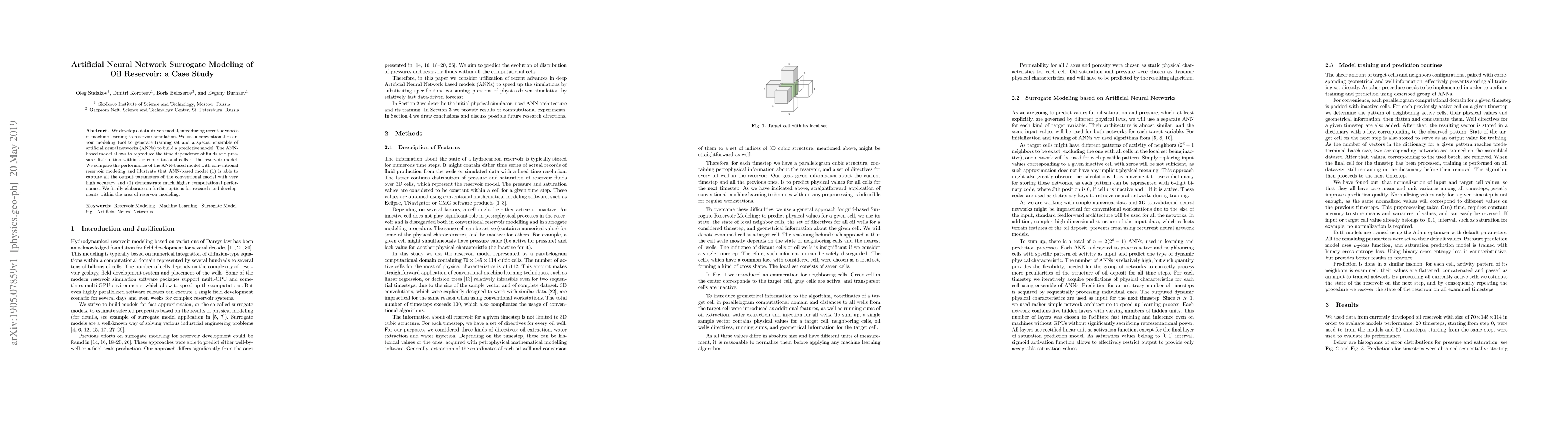 This paper develops an artificial neural network (ANN) surrogate model for oil reservoir simulation, trained using data from conventional modeling tools. The ANN model accurately reproduces fluid and pressure dynamics and outperforms conventional methods in computational efficiency.