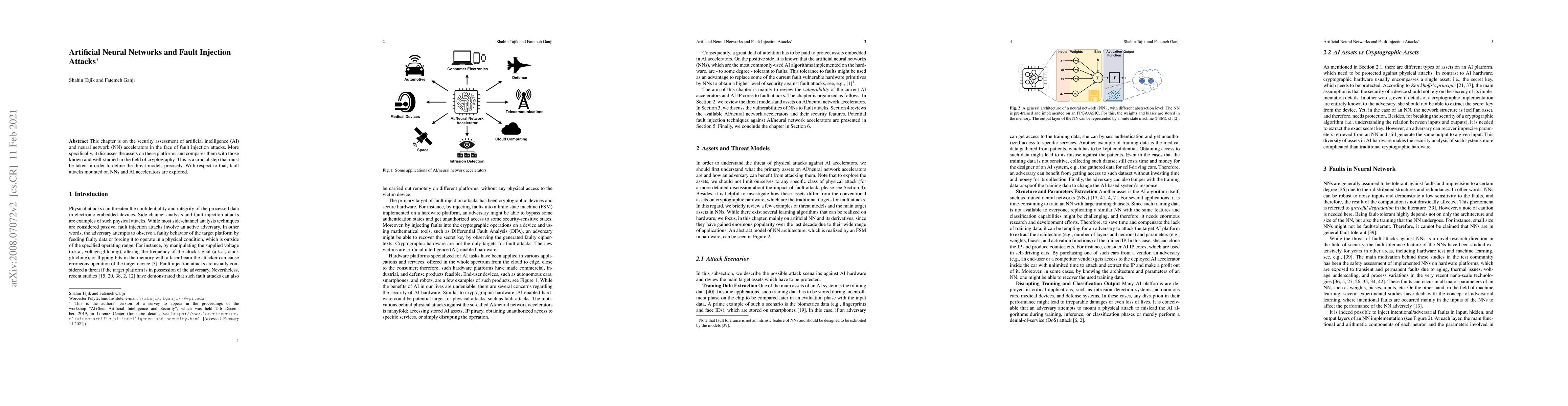This chapter is on the security assessment of artificial intelligence (AI) and neural network (NN) accelerators in the face of fault injection attacks. More specifically, it discusses the assets on these platforms and compares them with ones known and well-studied in the field of cryptographic systems. This is a crucial step that must be taken in order to define the threat models precisely. With respect to that, fault attacks mounted on NNs and AI accelerators are explored.