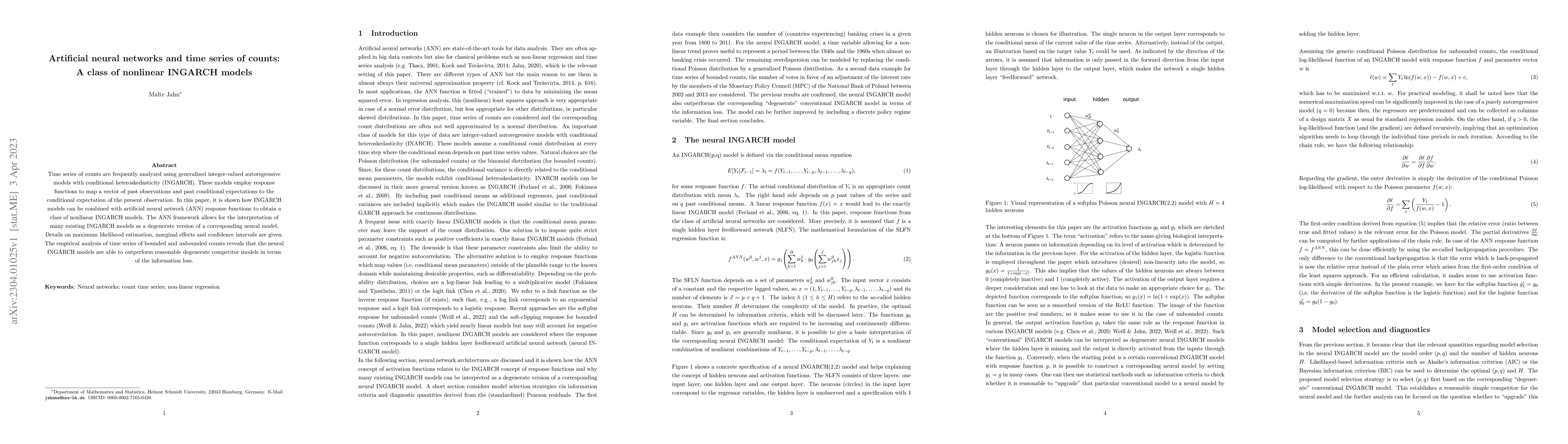 This paper combines artificial neural networks (ANN) with generalized integer-valued autoregressive models with conditional heteroskedasticity (INGARCH) to create a class of nonlinear INGARCH models. The empirical analysis shows that these neural INGARCH models outperform traditional INGARCH models in terms of information loss.