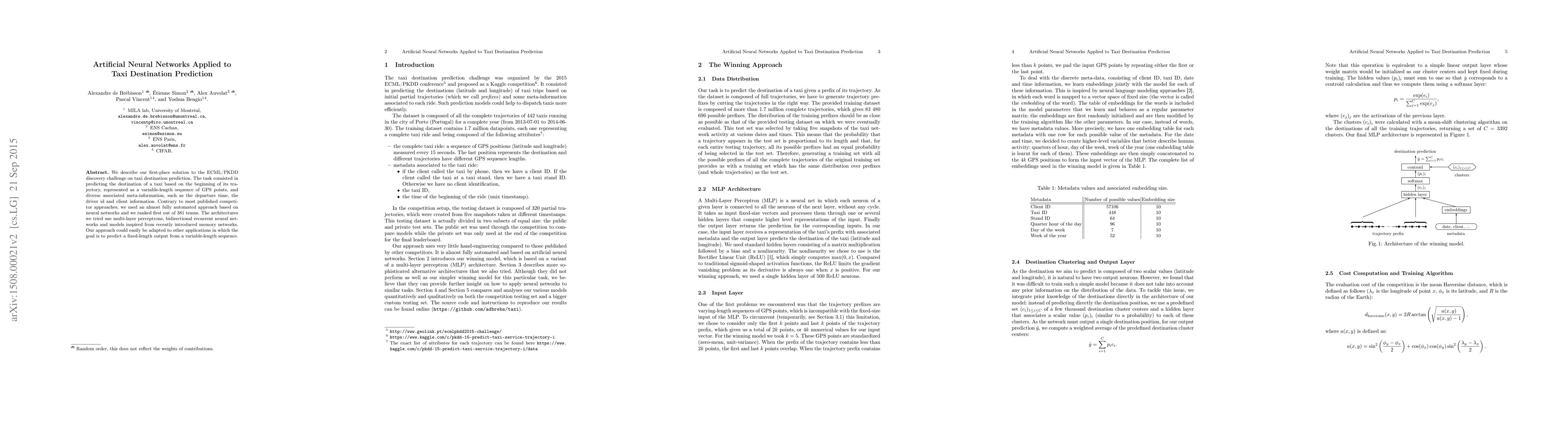 This research presents a winning solution for the ECML/PKDD challenge using artificial neural networks to predict taxi destinations based on GPS trajectories and meta-information. The authors employed a fully automated approach with multi-layer perceptrons, bidirectional RNNs, and memory networks, achieving first place among 381 teams.