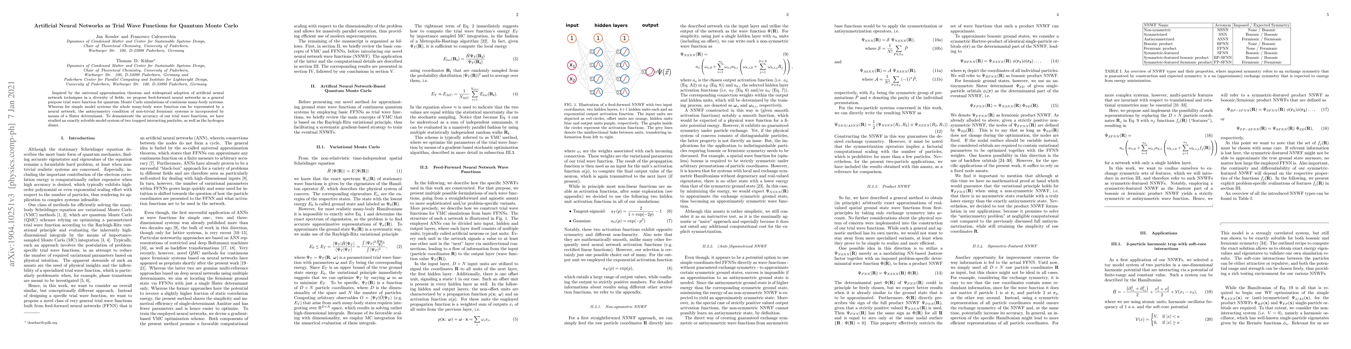 This paper proposes using feed-forward neural networks as trial wave functions for quantum Monte Carlo simulations, leveraging their universal approximation capabilities. The method incorporates the antisymmetry condition for fermionic systems via a Slater determinant, demonstrating accuracy through simulations of a two-particle model and the hydrogen dimer.