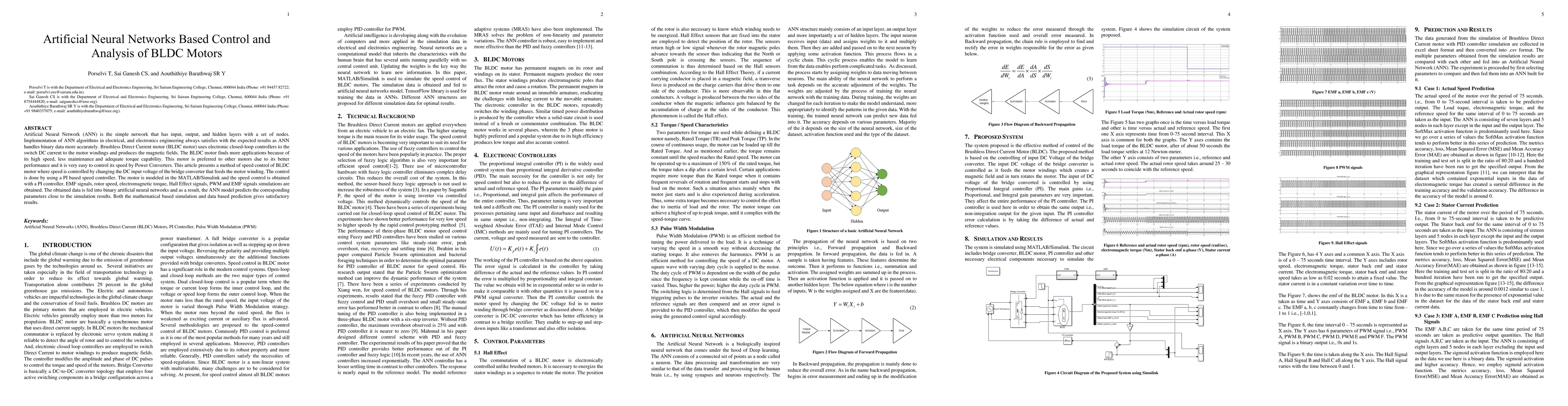 Artificial Neural Network (ANN) is a simple network that has an input, an output, and numerous hidden layers with a set of nodes. Implementation of ANN algorithms in electrical, and electronics engineering always satisfies with the expected results as ANN handles binary data more accurately. Brushless Direct Current motor (BLDC motor) uses electronic closed-loop controllers to switch DC current to the motor windings and produces the magnetic fields. The BLDC motor finds various applications owing to its high speed, low maintenance and adequate torque capability. They are highly preferred than the other motors because of their better performance and it is easy to control their speed by Power Converters. This article presents a method of speed control of BLDC motors where speed is controlled by changing the DC input voltage of the bridge converter that feeds the motor winding. The control is done by using a PI based speed controller. The motor is modeled in the MATLAB/Simulink and the speed control is obtained with a PI controller. EMF signals, rotor speed, electromagnetic torque, Hall Effect signals, PWM and EMF signals simulations are then obtained. This acquired data is then fed into binary artificial neural networks and as a result, the ANN model predicts the corresponding parameters close to the simulation results. Both the mathematical based simulation and data based prediction gives satisfactory results
