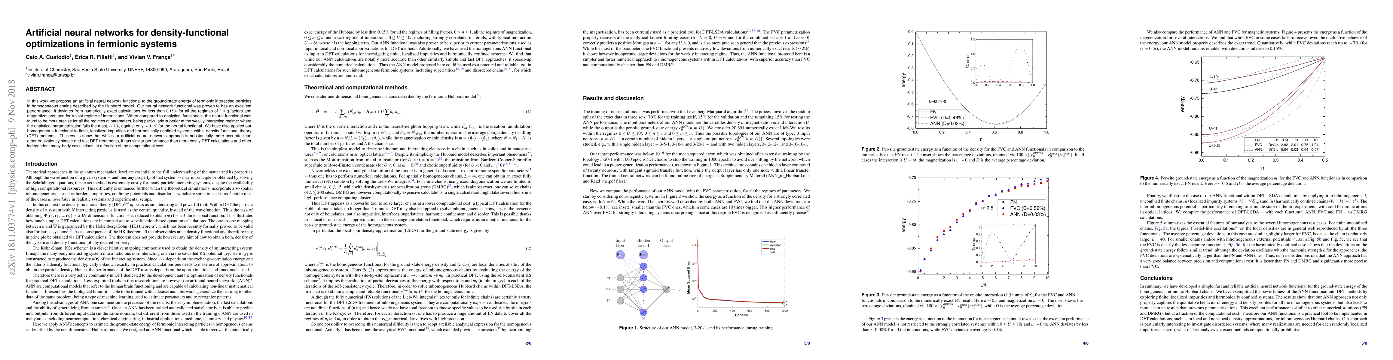 In this work we propose an artificial neural network functional to the ground-state energy of fermionic interacting particles in homogeneous chains described by the Hubbard model. Our neural network functional was proven to has an excellent performance: it deviates from numerically exact calculations by less than $0.15\%$ for all the regimes of filling factors and magnetizations, and for a vast regime of interactions. When compared to analytical functionals, the neural functional was found to be more precise for all the regimes of parameters, being particularly superior at the weakly interacting regime: where the analytical parametrization fails the most, $\sim7\%$, against only $\sim0.1\%$ for the neural functional. We have also applied our homogeneous functional to finite, localized impurities and harmonically confined systems within density-functional theory (DFT) methods. The results show that while our artificial neural network approach is substantially more accurate than other equivalently simple and fast DFT treatments, it has similar performance than more costly DFT calculations and other independent many-body calculations, at a fraction of the computational cost.