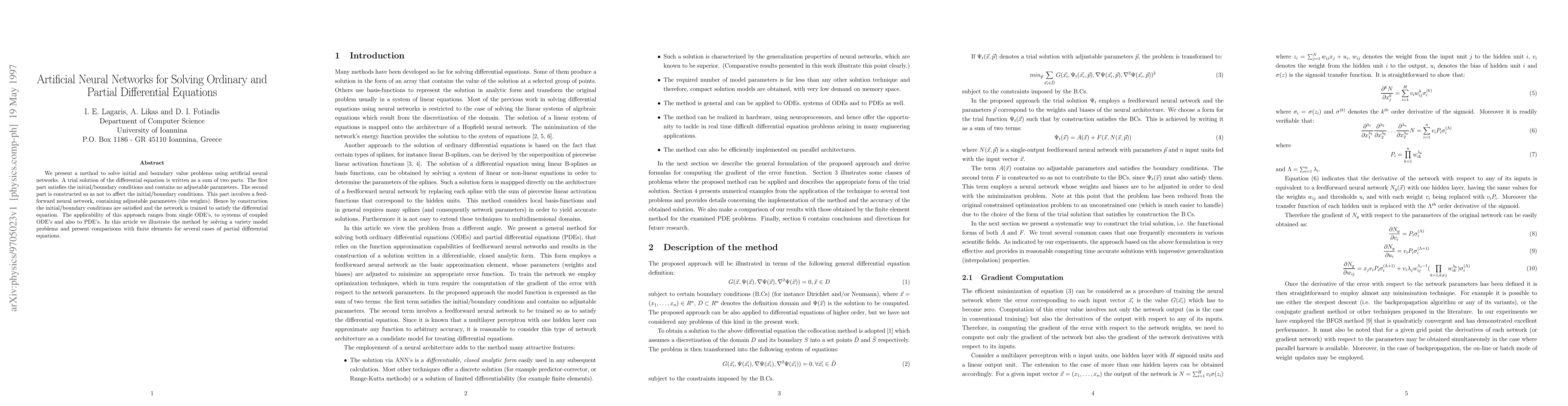 This paper proposes a method using artificial neural networks to solve ordinary and partial differential equations by dividing the trial solution into a part that satisfies boundary conditions and a neural network part trained to meet the differential equation. The method is demonstrated through various model problems and compared with finite element methods.
