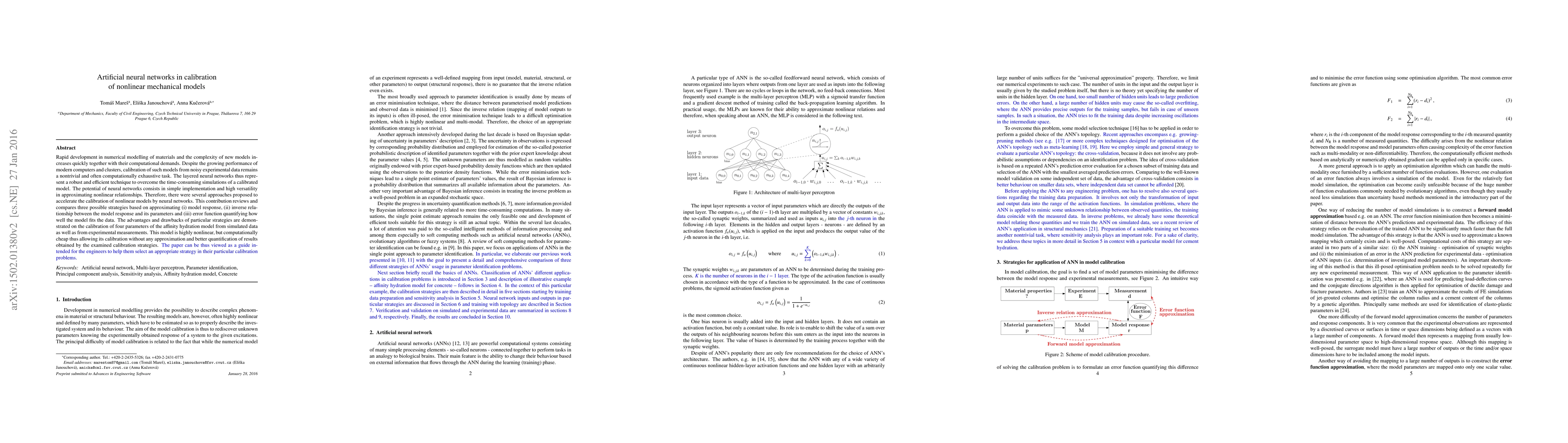 A study explores using artificial neural networks to speed up the calibration of complex nonlinear mechanical models from noisy data. Three strategies were tested, demonstrating their advantages and drawbacks in approximating model responses, inverse relationships, and error functions.