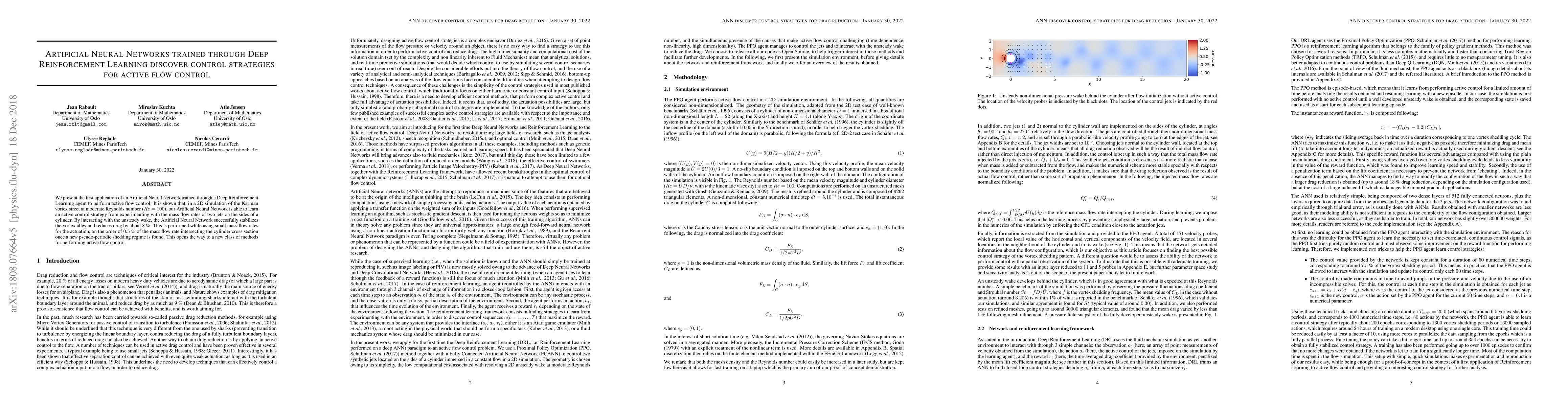 This paper explores the use of an Artificial Neural Network trained via Deep Reinforcement Learning to develop control strategies for active flow control in a simulated Karman vortex street. The trained network successfully stabilizes the vortex alley and reduces drag by 8% using minimal actuation, indicating a promising new approach for active flow control.