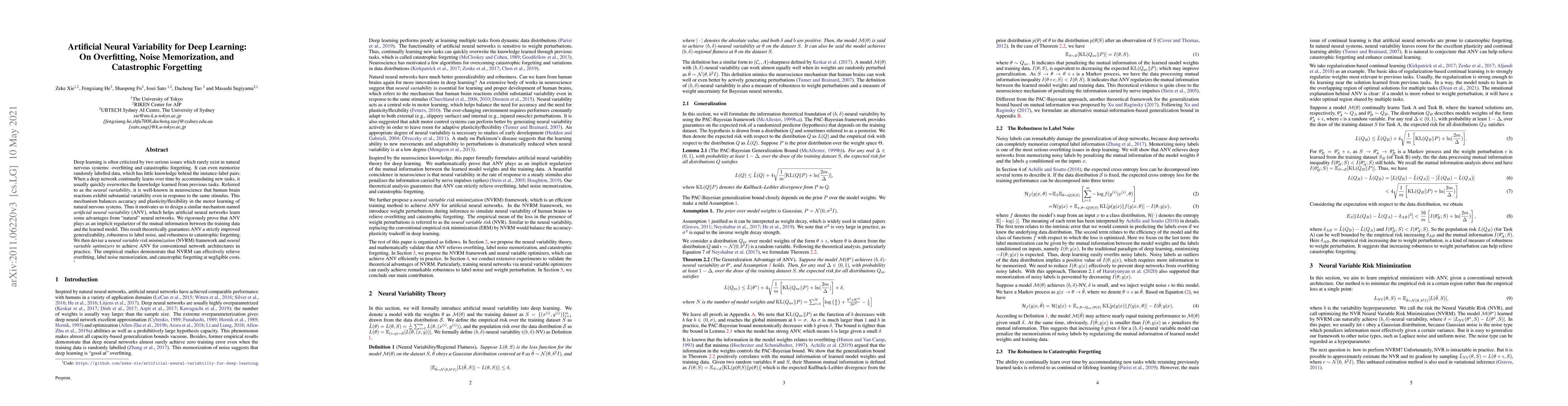 This paper proposes "artificial neural variability" (ANV) to address overfitting, catastrophic forgetting, and label noise in deep learning. ANV mimics the natural variability in neural responses, enhancing generalizability and robustness, and is implemented through a Neural Variable Risk Minimization (NVRM) framework, showing effective empirical results in mitigating these issues.