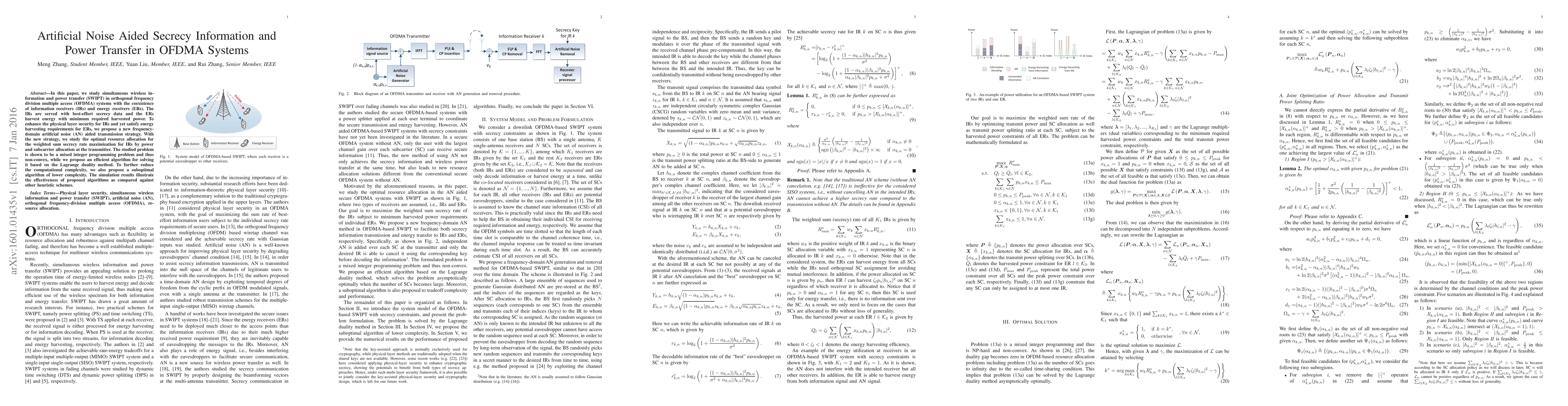 This paper proposes an artificial noise aided transmission strategy for SWIPT in OFDMA systems to enhance security for information receivers while meeting energy harvesting requirements for energy receivers. It introduces optimal resource allocation algorithms based on Lagrange duality and a lower complexity suboptimal approach, demonstrating their effectiveness through simulations.