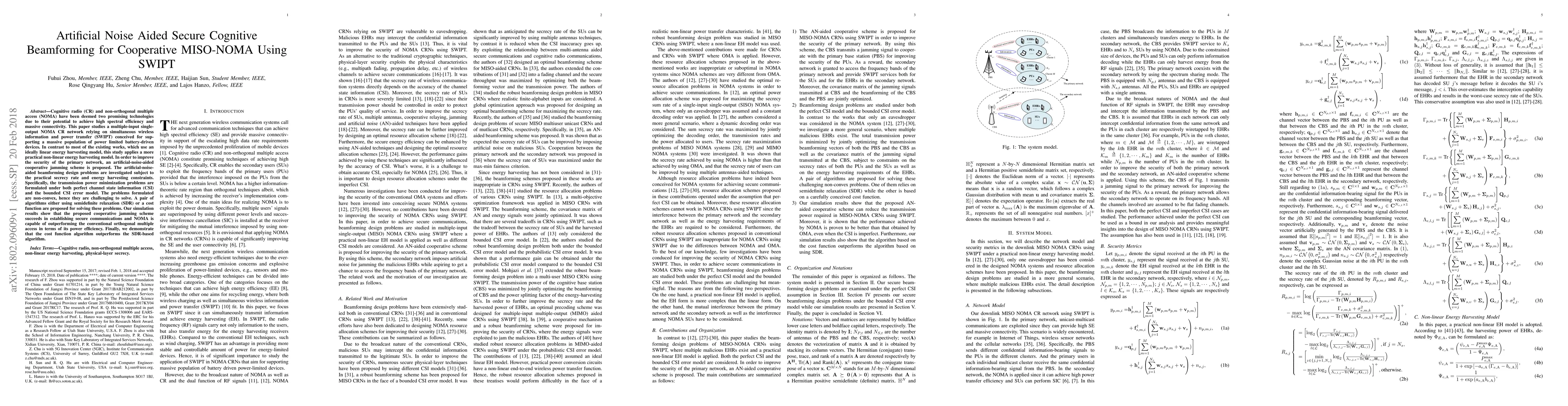 This paper explores secure artificial noise aided cognitive beamforming in a MISO-NOMA network using SWIPT, employing a non-linear energy harvesting model. It proposes a cooperative jamming scheme to enhance security and formulates power minimization problems, solved via semidefinite relaxation or a cost function, with simulations showing improved power efficiency over conventional OMA.