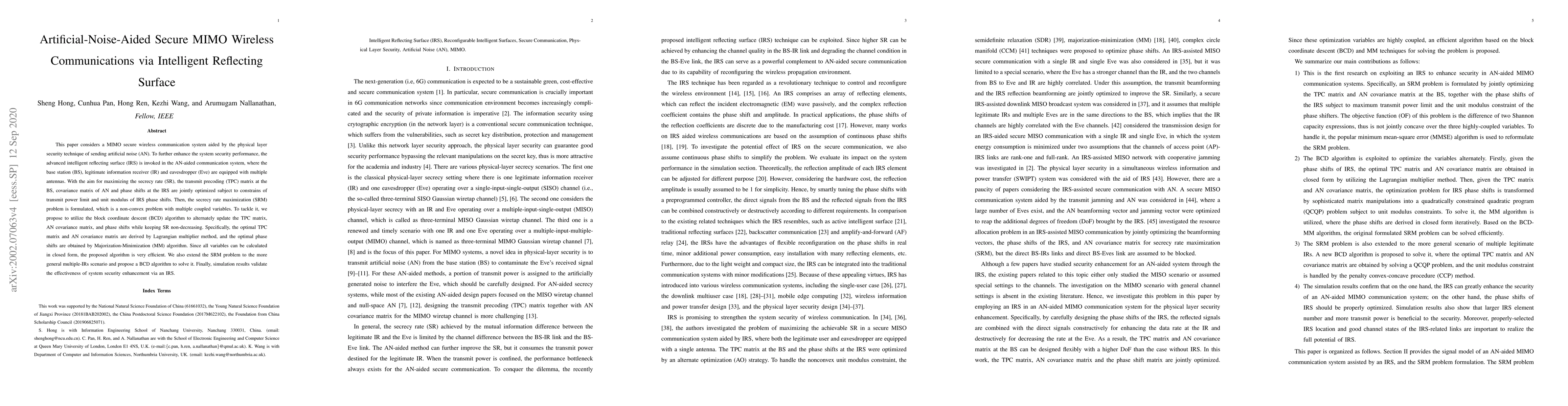 This paper optimizes a MIMO secure wireless communication system using artificial noise and an intelligent reflecting surface (IRS) to enhance security. A block coordinate descent algorithm is proposed to maximize the secrecy rate by jointly optimizing transmit precoding, artificial noise covariance, and IRS phase shifts. Simulation results confirm the effectiveness of the IRS in improving system security.