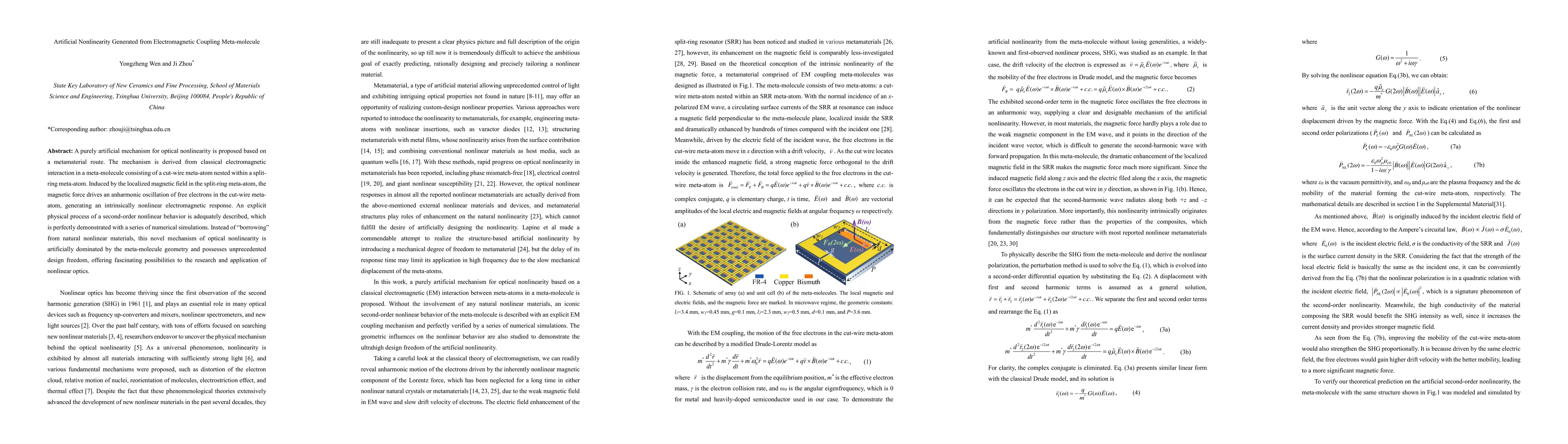 A purely artificial mechanism for optical nonlinearity is proposed based on a metamaterial route. The mechanism is derived from classical electromagnetic interaction in a meta-molecule consisting of a cut-wire meta-atom nested within a split-ring meta-atom. Induced by the localized magnetic field in the split-ring meta-atom, the magnetic force drives an anharmonic oscillation of free electrons in the cut-wire meta-atom, generating an intrinsically nonlinear electromagnetic response. An explicit physical process of a second-order nonlinear behavior is adequately described, which is perfectly demonstrated with a series of numerical simulations. Instead of "borrowing" from natural nonlinear materials, this novel mechanism of optical nonlinearity is artificially dominated by the meta-molecule geometry and possesses unprecedented design freedom, offering fascinating possibilities to the research and application of nonlinear optics.