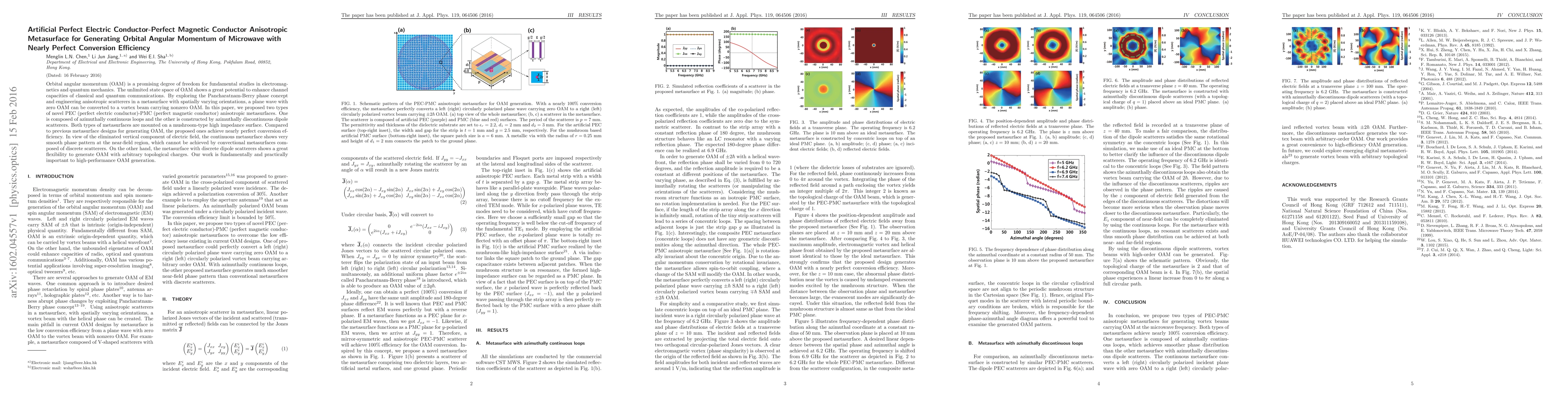This paper proposes two novel anisotropic metasurfaces based on PEC-PMC structures to generate microwave beams with orbital angular momentum (OAM) with nearly perfect conversion efficiency. The continuous loop design offers a smooth phase pattern, while the discrete dipole design provides flexibility for generating OAM with various topological charges.