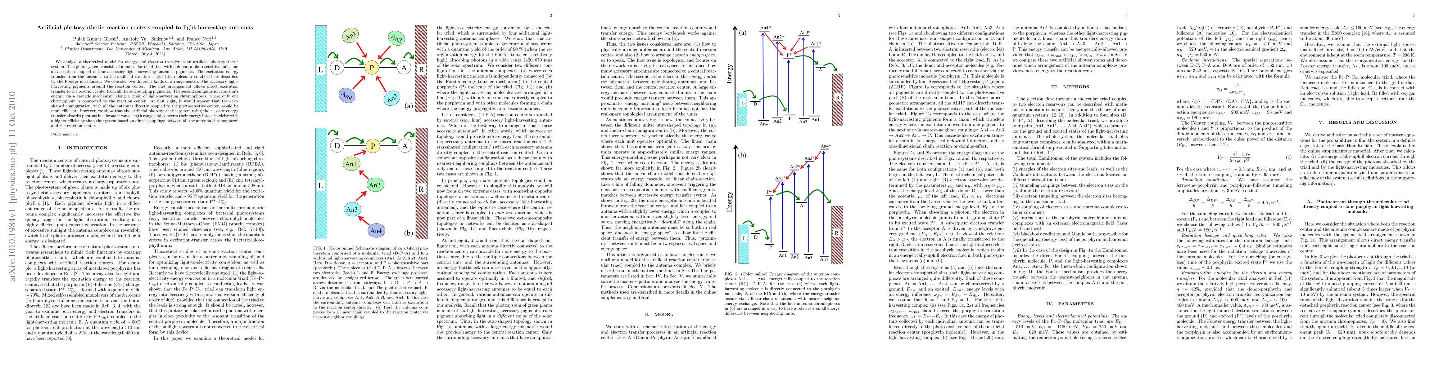 This paper investigates energy and electron transfer in an artificial photosynthetic system, comparing two configurations of light-harvesting antennas. It finds that a cascade mechanism, despite being less direct, achieves broader photon absorption and higher efficiency in converting energy to electricity compared to the star-shaped configuration.