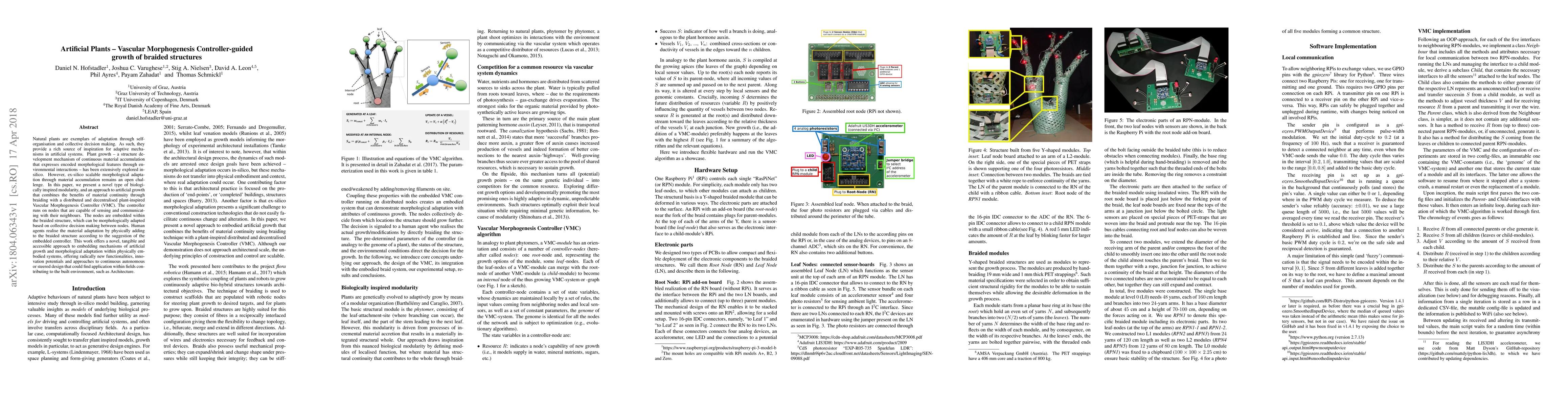 Natural plants are exemplars of adaptation through self-organisation and collective decision making. As such, they provide a rich source of inspiration for adaptive mechanisms in artificial systems. Plant growth - a structure development mechanism of continuous material accumulation that expresses encoded morphological features through environmental interactions - has been extensively explored in-silico. However, ex-silico scalable morphological adaptation through material accumulation remains an open challenge. In this paper, we present a novel type of biologically inspired modularity, and an approach to artificial growth that combines the benefits of material continuity through braiding with a distributed and decentralised plant-inspired Vascular Morphogenesis Controller (VMC). The controller runs on nodes that are capable of sensing and communicating with their neighbours. The nodes are embedded within the braided structure, which can be morphologically adapted based on collective decision making between nodes. Human agents realise the material adaptation by physically adding to the braided structure according to the suggestion of the embedded controller. This work offers a novel, tangible and accessible approach to embedding mechanisms of artificial growth and morphological adaptation within physically embodied systems, offering radically new functionalities, innovation potentials and approaches to continuous autonomous or steered design that could find application within fields contributing to the built environment, such as Architecture.