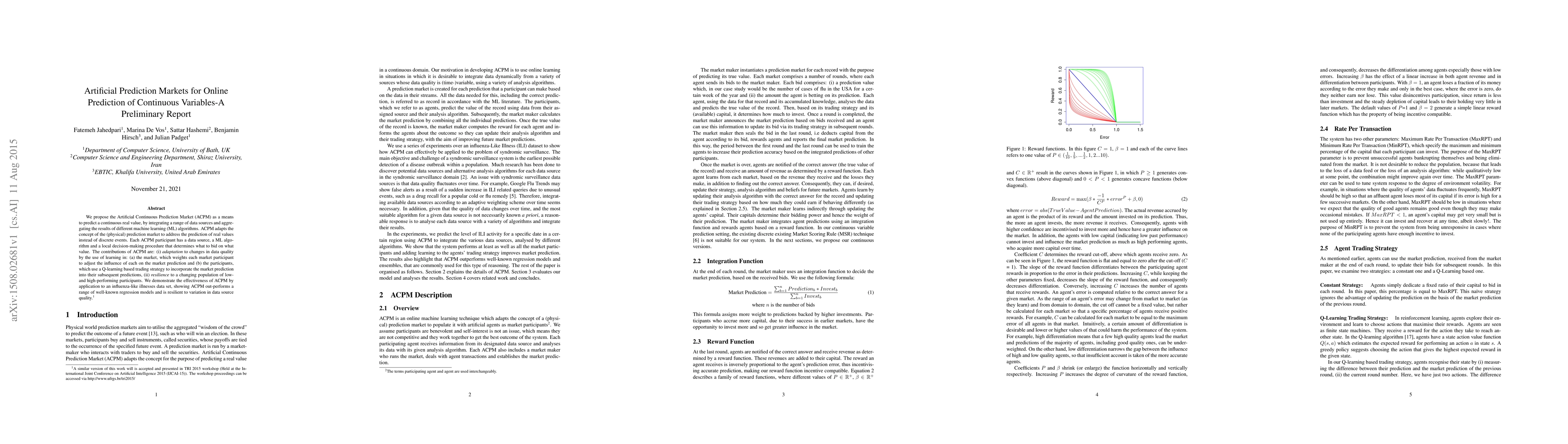 We propose the Artificial Continuous Prediction Market (ACPM) as a means to predict a continuous real value, by integrating a range of data sources and aggregating the results of different machine learning (ML) algorithms. ACPM adapts the concept of the (physical) prediction market to address the prediction of real values instead of discrete events. Each ACPM participant has a data source, a ML algorithm and a local decision-making procedure that determines what to bid on what value. The contributions of ACPM are: (i) adaptation to changes in data quality by the use of learning in: (a) the market, which weights each market participant to adjust the influence of each on the market prediction and (b) the participants, which use a Q-learning based trading strategy to incorporate the market prediction into their subsequent predictions, (ii) resilience to a changing population of low- and high-performing participants. We demonstrate the effectiveness of ACPM by application to an influenza-like illnesses data set, showing ACPM out-performs a range of well-known regression models and is resilient to variation in data source quality.