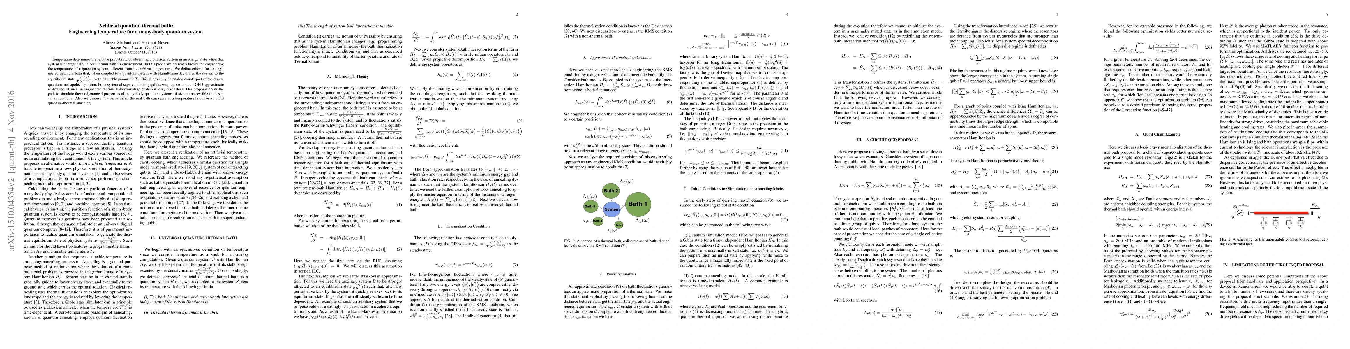 This research introduces a theory for engineering the temperature of a quantum system, distinct from its ambient temperature, using an 'artificial quantum thermal bath'. The method, applicable to many-body quantum systems, is demonstrated for superconducting qubits with a proposed circuit-QED realization. It paves the way for simulating thermodynamic properties of large quantum systems and offers a temperature control mechanism for hybrid quantum-thermal annealers.