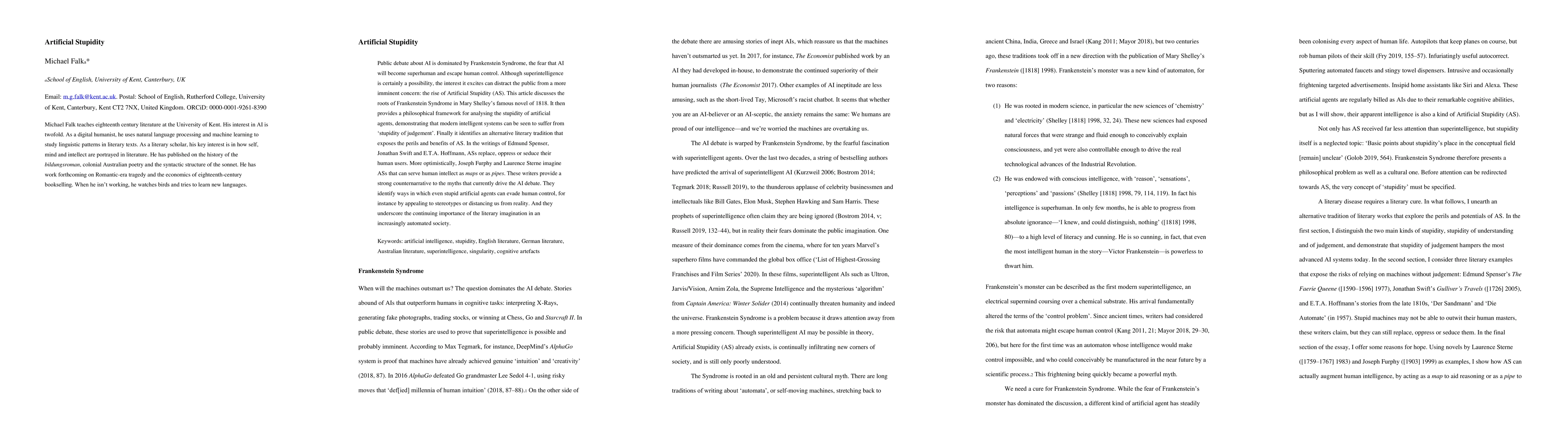 Public debate about AI is dominated by Frankenstein Syndrome, the fear that AI will become superhuman and escape human control. Although superintelligence is certainly a possibility, the interest it excites can distract the public from a more imminent concern: the rise of Artificial Stupidity (AS). This article discusses the roots of Frankenstein Syndrome in Mary Shelley's famous novel of 1818. It then provides a philosophical framework for analysing the stupidity of artificial agents, demonstrating that modern intelligent systems can be seen to suffer from 'stupidity of judgement'. Finally it identifies an alternative literary tradition that exposes the perils and benefits of AS. In the writings of Edmund Spenser, Jonathan Swift and E.T.A. Hoffmann, ASs replace, oppress or seduce their human users. More optimistically, Joseph Furphy and Laurence Sterne imagine ASs that can serve human intellect as maps or as pipes. These writers provide a strong counternarrative to the myths that currently drive the AI debate. They identify ways in which even stupid artificial agents can evade human control, for instance by appealing to stereotypes or distancing us from reality. And they underscore the continuing importance of the literary imagination in an increasingly automated society.