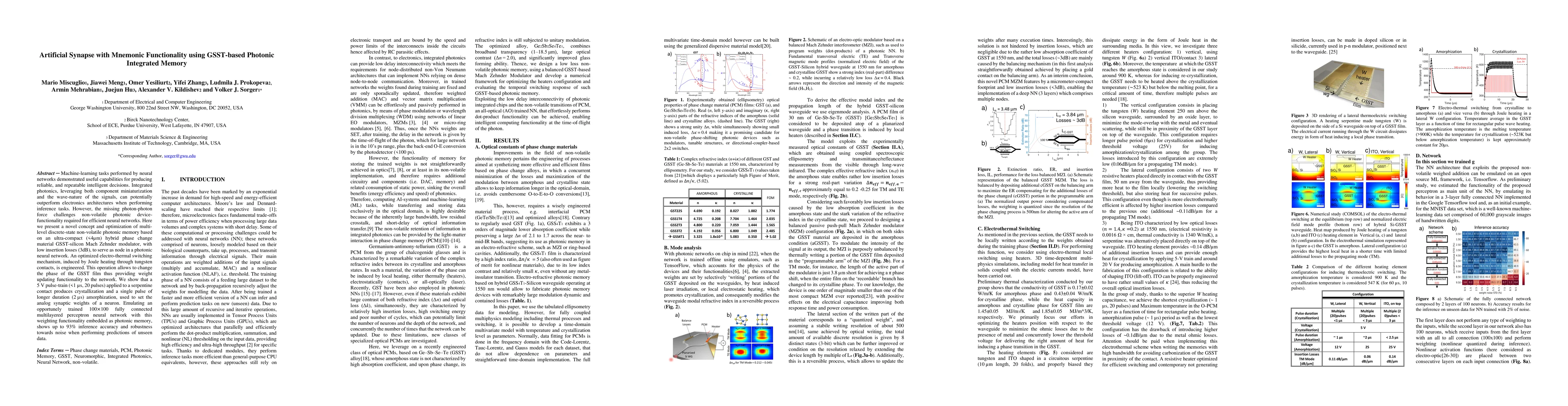 This paper introduces a novel photonic memory device based on GSST material integrated with a silicon Mach-Zehnder modulator, enabling artificial synapse functionality with low insertion losses. The device uses Joule heating to switch between crystalline and amorphous states, emulating synaptic weights in a neural network, achieving up to 93% inference accuracy.