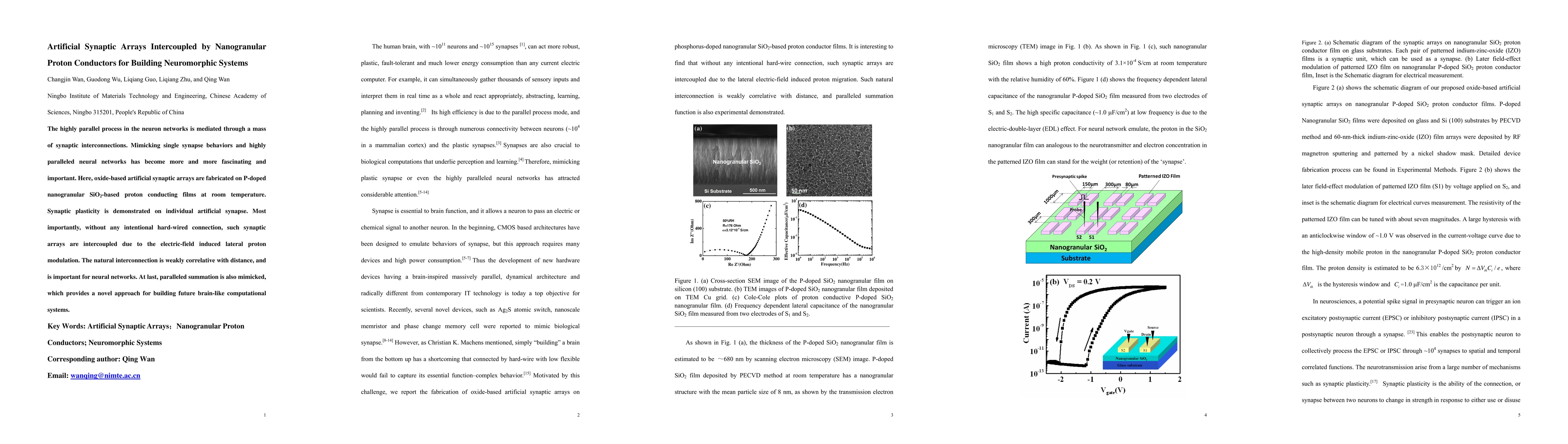 This paper presents oxide-based artificial synaptic arrays intercoupled by nanogranular proton conductors, demonstrating synaptic plasticity and natural interconnection without hard-wired connections, which mimics neural networks and offers a novel approach for neuromorphic computing.
