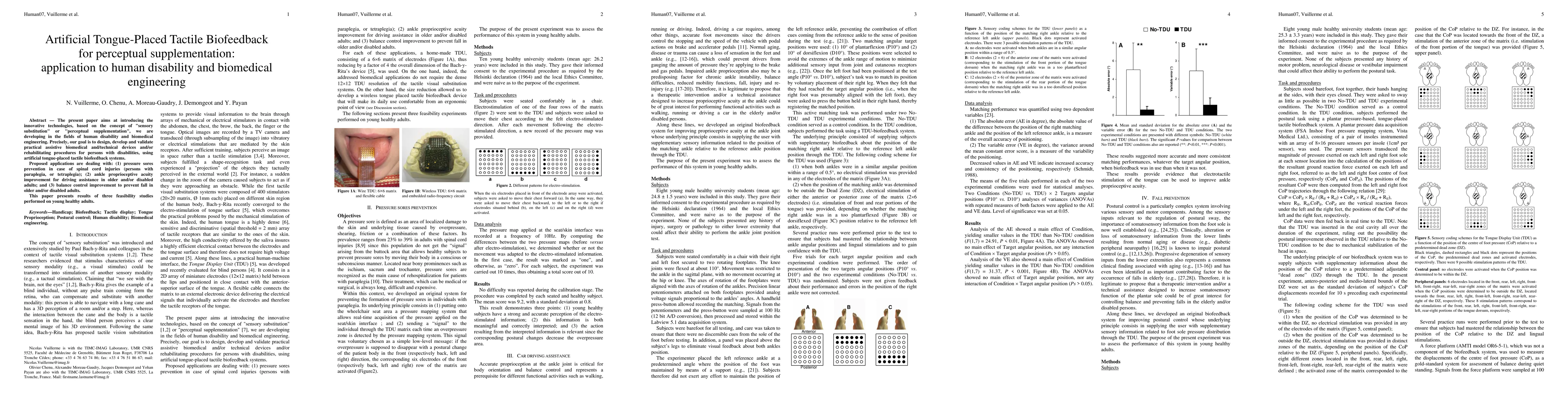 The present paper aims at introducing the innovative technologies, based on the concept of "sensory substitution" or "perceptual supplementation", we are developing in the fields of human disability and biomedical engineering. Precisely, our goal is to design, develop and validate practical assistive biomedical and/technical devices and/or rehabilitating procedures for persons with disabilities, using artificial tongue-placed tactile biofeedback systems. Proposed applications are dealing with: (1) pressure sores prevention in case of spinal cord injuries (persons with paraplegia, or tetraplegia); (2) ankle proprioceptive acuity improvement for driving assistance in older and/or disabled adults; and (3) balance control improvement to prevent fall in older and/or disabled adults. This paper presents results of three feasibility studies performed on young healthy adults.