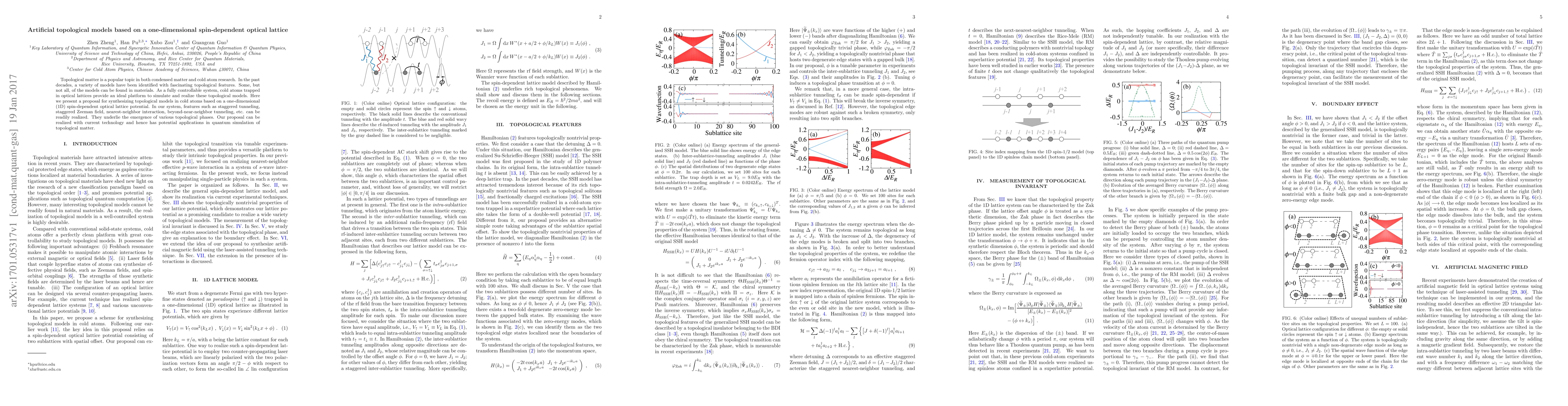 Topological matter is a popular topic in both condensed matter and cold atom research. In the past decades, a variety of models have been identified with fascinating topological features. Some, but not all, of the models can be found in materials. As a fully controllable system, cold atoms trapped in optical lattices provide an ideal platform to simulate and realize these topological models. Here we present a proposal for synthesizing topological models in cold atoms based on a one-dimensional (1D) spin-dependent optical lattice potential. In our system, features such as staggered tunneling, staggered Zeeman field, nearest-neighbor interaction, beyond-near-neighbor tunneling, etc. can be readily realized. They underlie the emergence of various topological phases. Our proposal can be realized with current technology and hence has potential applications in quantum simulation of topological matter.