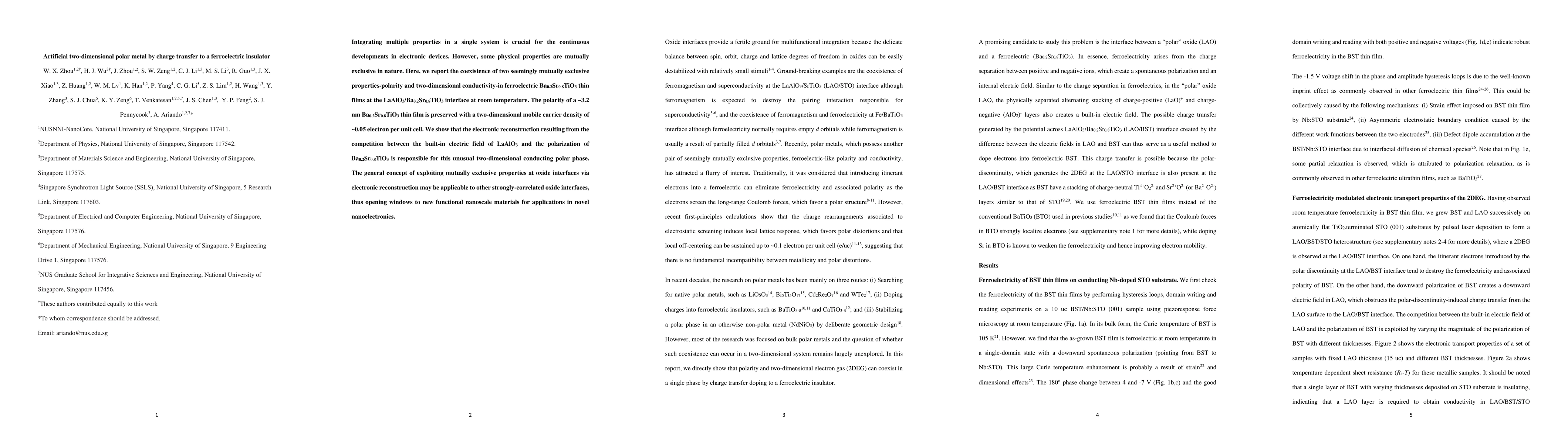 Integrating multiple properties in a single system is crucial for the continuous developments in electronic devices. However, some physical properties are mutually exclusive in nature. Here, we report the coexistence of two seemingly mutually exclusive properties-polarity and two-dimensional conductivity-in ferroelectric Ba$_{0.2}$Sr$_{0.8}$TiO$_3$ thin films at the LaAlO$_3$/Ba$_{0.2}$Sr$_{0.8}$TiO$_3$ interface at room temperature. The polarity of a ~3.2 nm Ba$_{0.2}$Sr$_{0.8}$TiO$_3$ thin film is preserved with a two-dimensional mobile carrier density of ~0.05 electron per unit cell. We show that the electronic reconstruction resulting from the competition between the built-in electric field of LaAlO$_3$ and the polarization of Ba$_{0.2}$Sr$_{0.8}$TiO$_3$ is responsible for this unusual two-dimensional conducting polar phase. The general concept of exploiting mutually exclusive properties at oxide interfaces via electronic reconstruction may be applicable to other strongly-correlated oxide interfaces, thus opening windows to new functional nanoscale materials for applications in novel nanoelectronics.