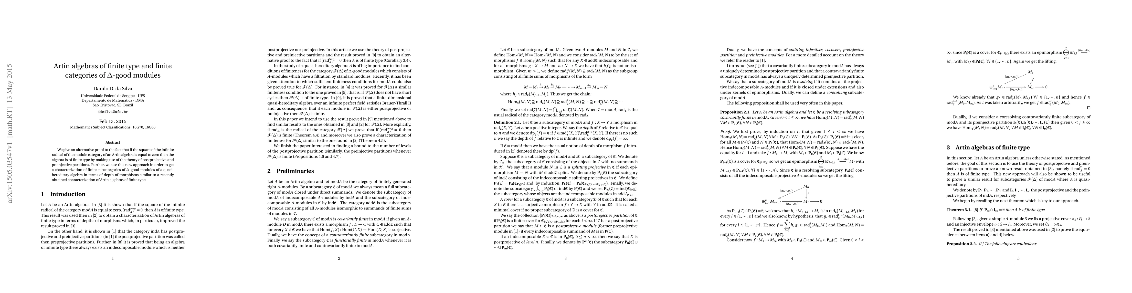 We give an alternative proof to the fact that if the square of the infinite radical of the module category of an Artin algebra is equal to zero then the algebra is of finite type by making use of the theory of postprojective and preinjective partitions. Further, we use this new approach in order to get a characterization of finite subcategories of $\Delta$-good modules of a quasi-hereditary algebra in terms of depth of morphisms similar to a recently obtained characterization of Artin algebras of finite type.
