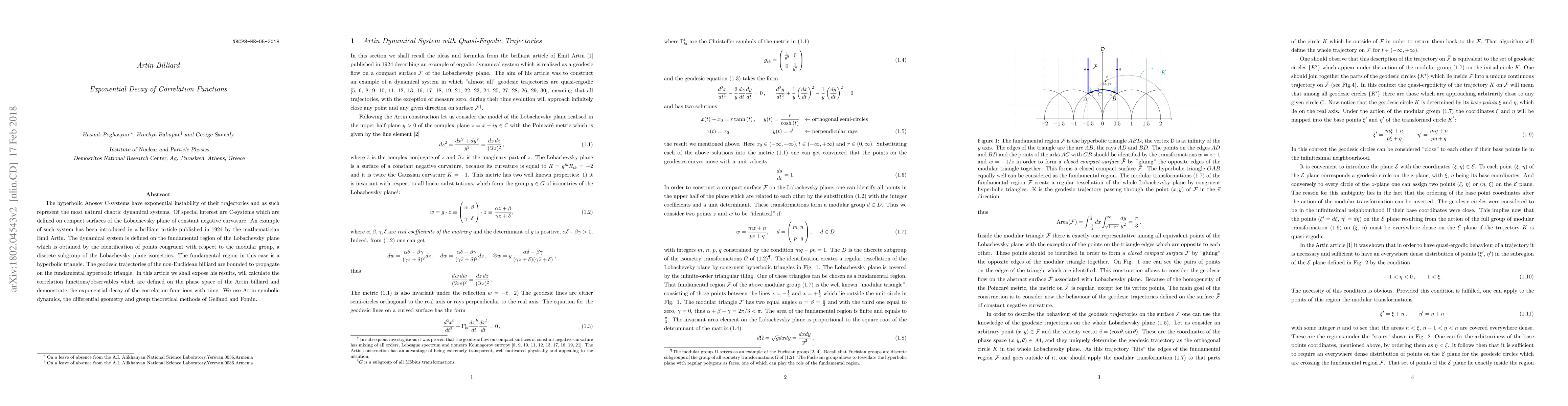 The hyperbolic Anosov C-systems have exponential instability of their trajectories and as such represent the most natural chaotic dynamical systems. Of special interest are C-systems which are defined on compact surfaces of the Lobachevsky plane of constant negative curvature. An example of such system has been introduced in a brilliant article published in 1924 by the mathematician Emil Artin. The dynamical system is defined on the fundamental region of the Lobachevsky plane which is obtained by the identification of points congruent with respect to the modular group, a discrete subgroup of the Lobachevsky plane isometries. The fundamental region in this case is a hyperbolic triangle. The geodesic trajectories of the non-Euclidean billiard are bounded to propagate on the fundamental hyperbolic triangle. In this article we shall expose his results, will calculate the correlation functions/observables which are defined on the phase space of the Artin billiard and demonstrate the exponential decay of the correlation functions with time. We use Artin symbolic dynamics, the differential geometry and group theoretical methods of Gelfand and Fomin.