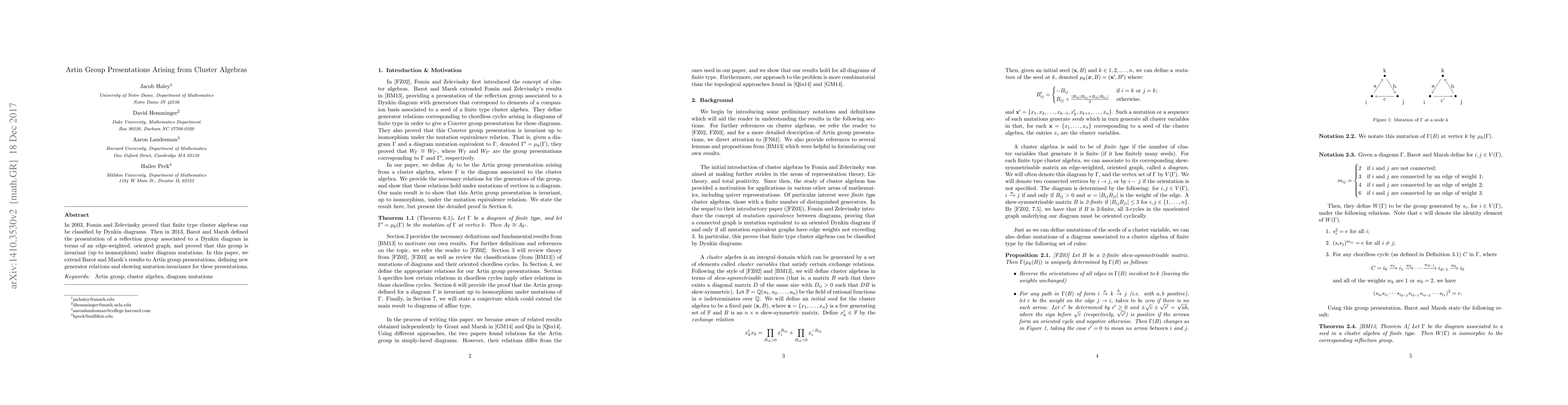 This paper extends Barot and Marsh's work on reflection groups to Artin groups, defining new generator relations for Artin groups arising from cluster algebras. It demonstrates that these Artin group presentations remain invariant under diagram mutations, akin to the reflection groups.