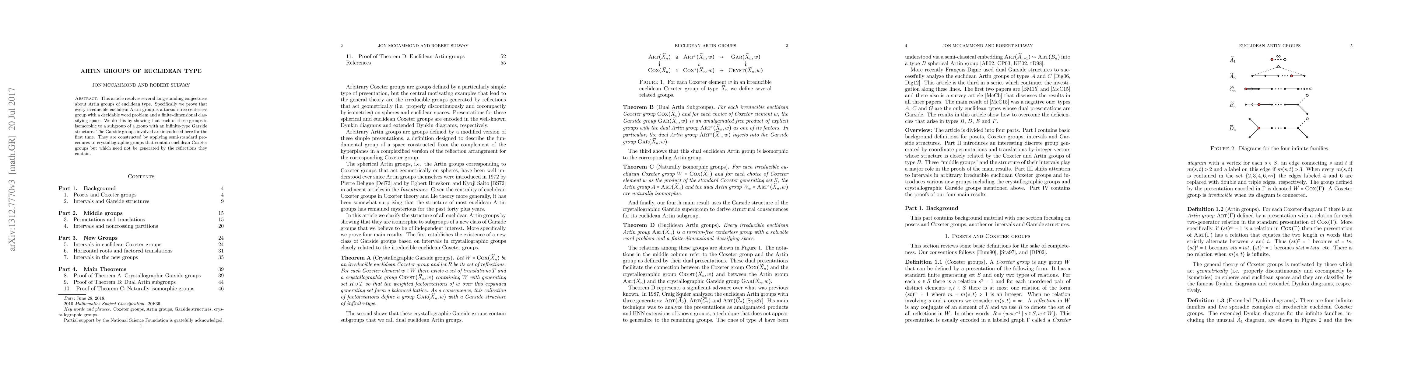 This paper resolves longstanding conjectures about euclidean Artin groups, proving they are torsion-free, centerless, and have decidable word problems. The study demonstrates their finite-dimensional classifying space and subgroup isomorphism to newly introduced Garside groups.