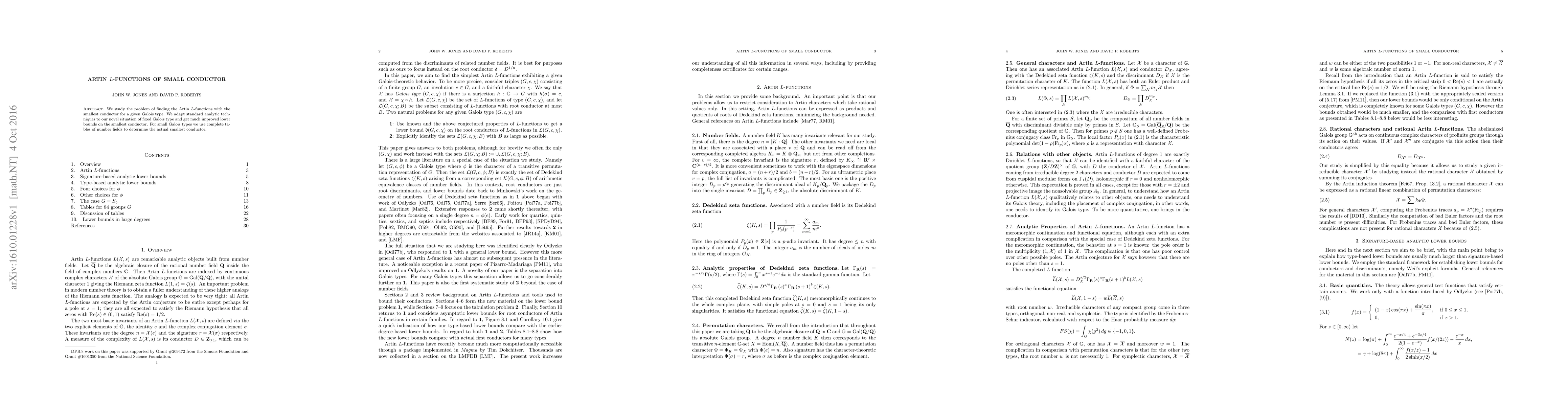 This paper investigates Artin L-functions with the smallest conductor for specified Galois types, employing advanced analytic methods to achieve better lower bounds. For small Galois types, it utilizes comprehensive tables of number fields to pinpoint the exact minimal conductor.