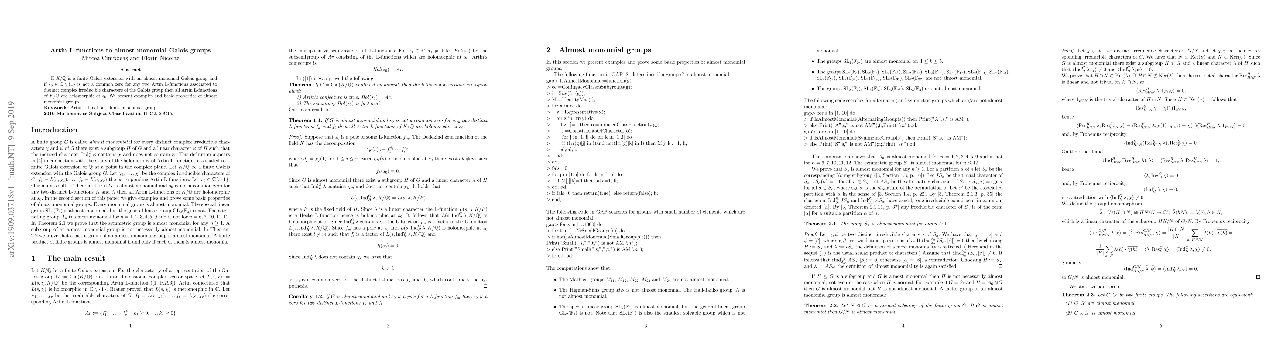 If $K/\mathbb Q$ is a finite Galois extension with an almost monomial Galois group and if $s_0\in\mathbb C\setminus\{1\}$ is not a common zero for any two Artin L-functions associated to distinct complex irreducible characters of the Galois group then all Artin L-functions of $K/\mathbb Q$ are holomorphic at $s_0$. We present examples and basic properties of almost monomial groups.