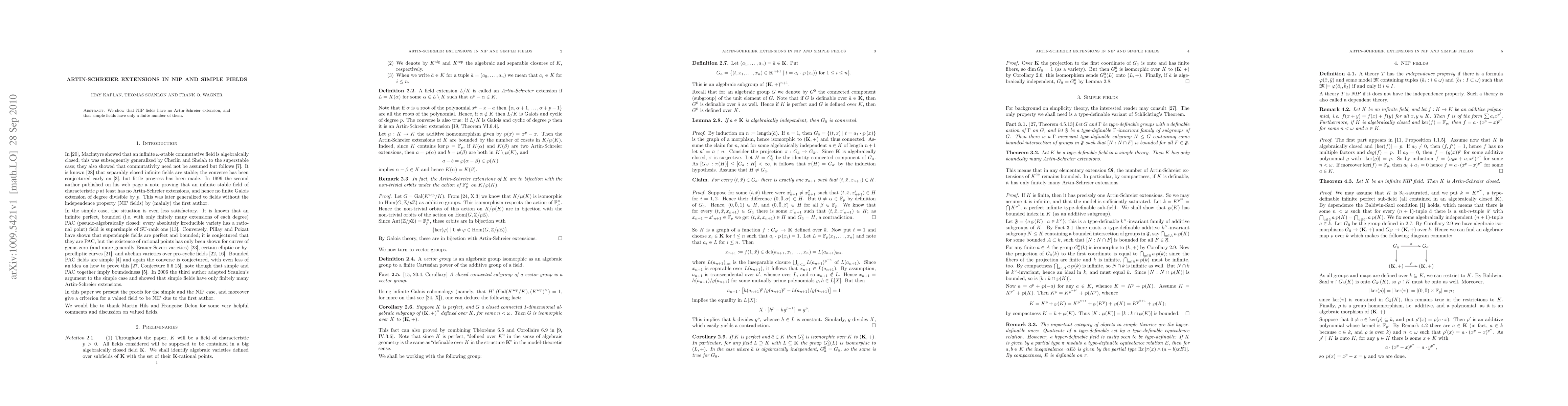 Summary: This paper demonstrates that fields with the NIP (Not the Independence Property) characteristic lack any Artin-Schreier extensions, while simple fields contain only a finite number of such extensions.
