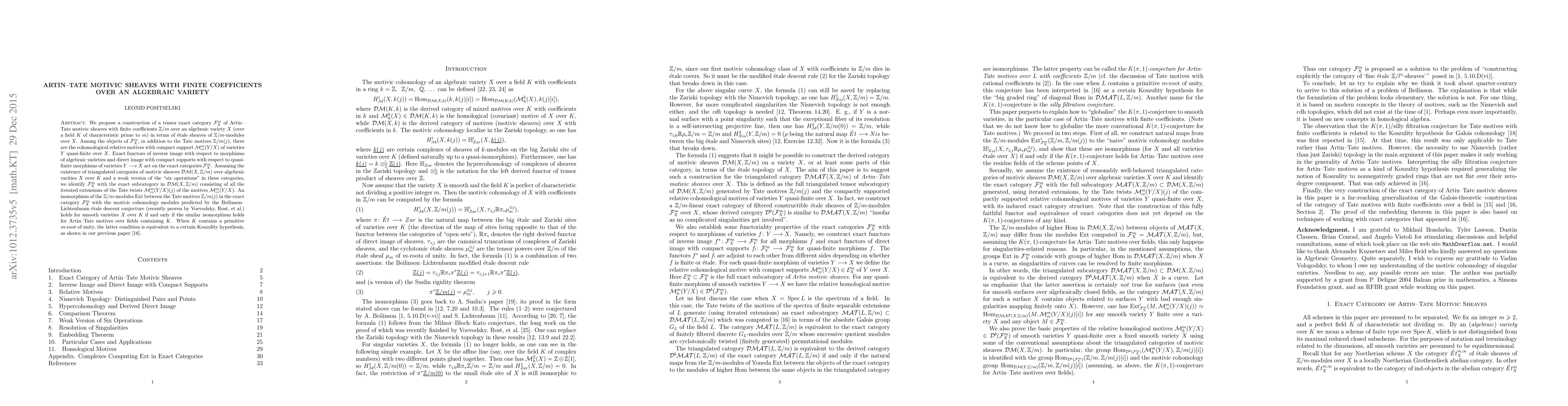 We propose a construction of a tensor exact category F_X^m of Artin-Tate motivic sheaves with finite coefficients Z/m over an algebraic variety X (over a field K of characteristic prime to m) in terms of etale sheaves of Z/m-modules over X. Among the objects of F_X^m, in addition to the Tate motives Z/m(j), there are the cohomological relative motives with compact support M_cc^m(Y/X) of varieties Y quasi-finite over X. Exact functors of inverse image with respect to morphisms of algebraic varieties and direct image with compact supports with respect to quasi-finite morphisms of varieties Y\to X act on the exact categories F_X^m. Assuming the existence of triangulated categories of motivic sheaves DM(X,Z/m) over algebraic varities X over K and a weak version of the "six operations" in these categories, we identify F_X^m with the exact subcategory in DM(X,Z/m) consisting of all the iterated extensions of the Tate twists M_cc^m(Y/X)(j) of the motives M_cc^m(Y/X). An isomorphism of the Z/m-modules Ext between the Tate motives Z/m(j) in the exact category F_X^m with the motivic cohomology modules predicted by the Beilinson-Lichtenbaum etale descent conjecture (recently proven by Voevodsky, Rost, et al.) holds for smooth varieties X over K if and only if the similar isomorphism holds for Artin-Tate motives over fields containing K. When K contains a primitive m-root of unity, the latter condition is equivalent to a certain Koszulity hypothesis, as it was shown in our previous paper arXiv:1006.4343